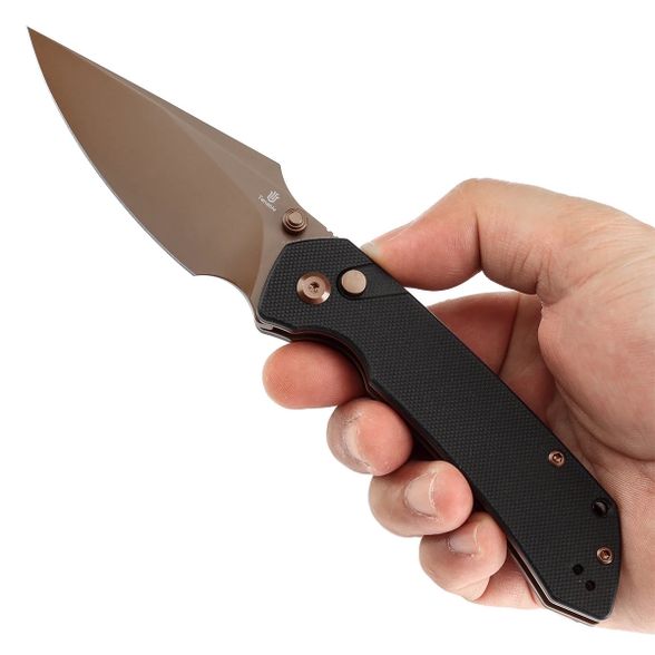 Чёрная рукоять из G10 с выраженной текстурой обеспечивает надёжный хват и комфорт при длительном использовании. Форма адаптирована под различные типы удержания, а плавные контуры способствуют естественному положению в руке. Материал устойчив к загрязнениям, не скользит и легко очищается. Конструкция рукояти продумана для стабильного контроля в любых условиях.