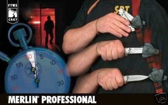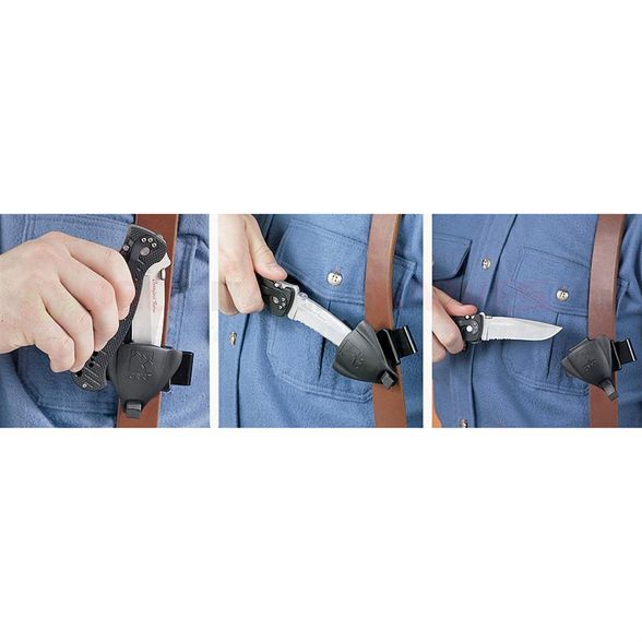 Тактические ножны для складных ножей Merlin Professional разрабатывались для полицейских, пожарников и работников других служб экстренной помощи. Подходят данные тактические ножны для ножа с длиной лезвия от 6,4 до 12,7 см и шириной клинка до 3,8 см. Особенность конструкции - это ношение ножа в полураскрытом положении, что дает возможность при извлечении привести клинок в готовность менее чем за секунду. Ножны для складного ножа состоят из трех компонентов: клипсы с пружиной, фиксирующего держателя и поворотной системы с восемью позициями, соединяющей их. Ножны легко фиксируются не только в горизонтальном, но также в вертикальном положении.