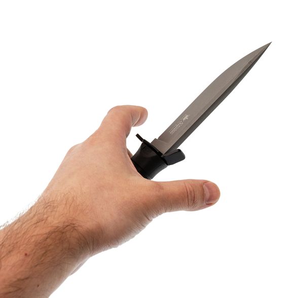 Форма рукояти разработана с упором на надёжный хват. Гарда фиксирует руку и предотвращает соскальзывание, а компактные размеры делают модель удобной для ношения на экипировке.