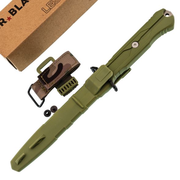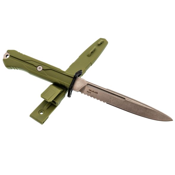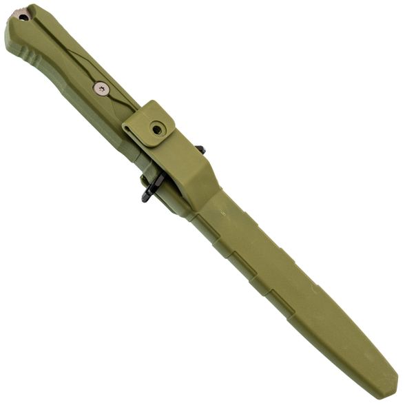 Ножны пластиковые, под цвет рукояти - олива. Крепление Molle позволяет разместить их где угодно. Фиксация жёсткая, с защёлкиванием. Чтобы вынуть нож, нужно приложить небольшое усилие, но в походе это плюс - случайно не потеряете.