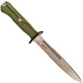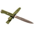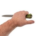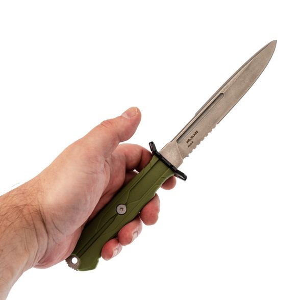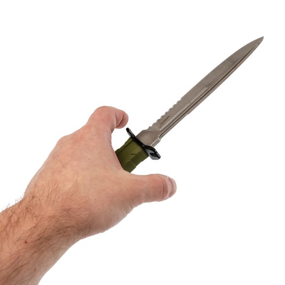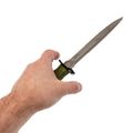 Хват полный, рука не проваливается. Упоры отличные - даже в мокрых перчатках пальцы не съезжают на лезвие. Сквозной монтаж хвостовика - это надёжность на долгие годы. Рукоять цвета олива, приятная на вид, немаркая. Темлячное отверстие присутствует.