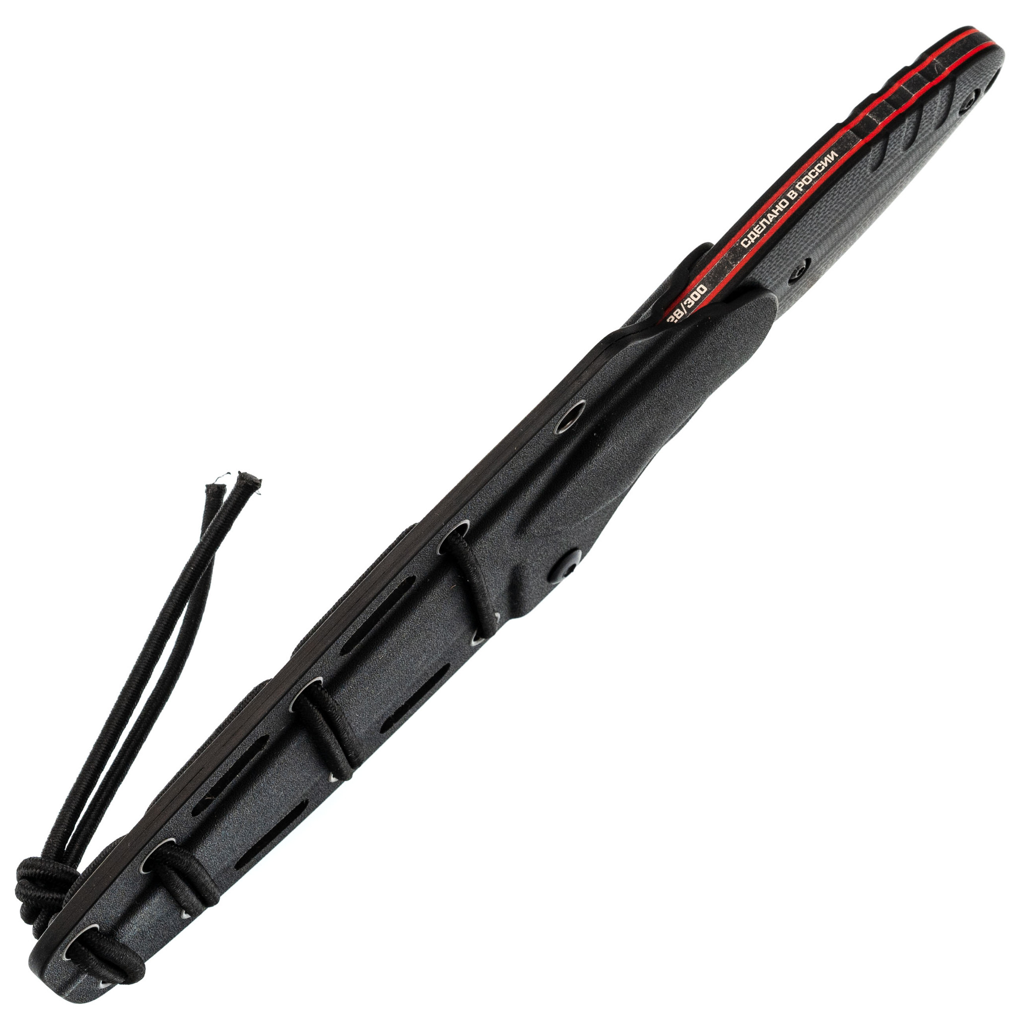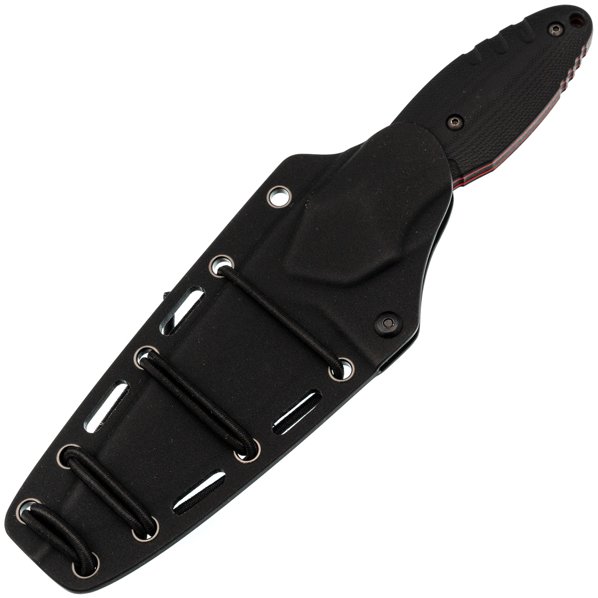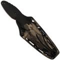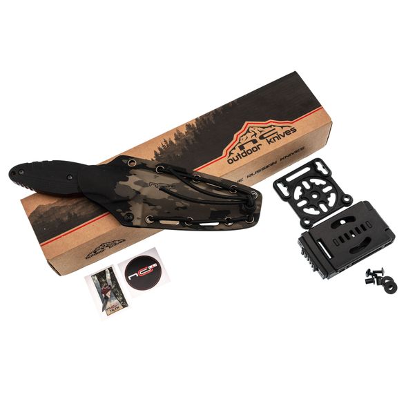 Ножны изготовлены из кайдекса — термопластика, точно повторяющего форму ножа. Они обеспечивают надежную фиксацию, исключая выпадение даже при интенсивном движении или ношении рукоятью вниз. В комплект входят шоккорд, позволяющий закрепить нож на снаряжении, и устройство типа Tek-Lok, которое дает возможность носить его горизонтально или вертикально на поясе.