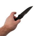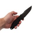 Рукоять изготовлена из стеклотекстолита G10, который обладает высокой прочностью, легкостью и водостойкостью. Цельнометаллический монтаж обеспечивает максимальную надежность конструкции. Рукоять имеет плоский профиль, что облегчает ношение ножа. Эргономичная форма с фрезеровками для цепкости и скосами к пяте клинка позволяет уверенно удерживать нож различными хватами, включая поварской. Также предусмотрено отверстие для темляка.