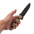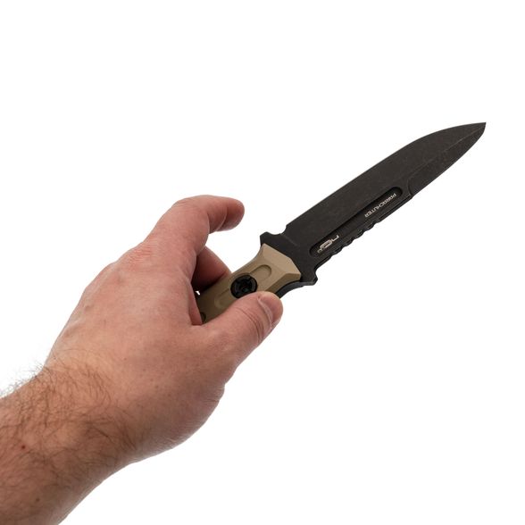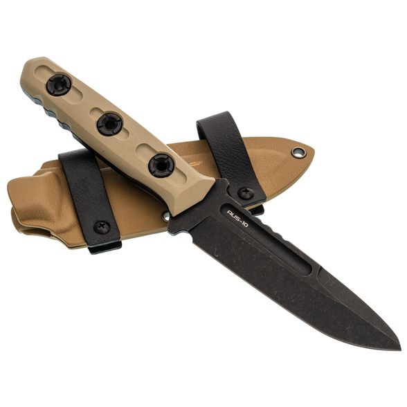 Рукоять выполнена из стеклотекстолита G10 по технологии накладного монтажа, когда нож представляет собой цельный кусок стали с накладываемыми накладками. Материал G10 прочный, лёгкий и устойчив к воздействию погодных условий, влаги и грязи. Развитые упоры обеспечивают безопасное удержание ножа.