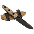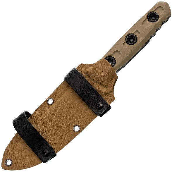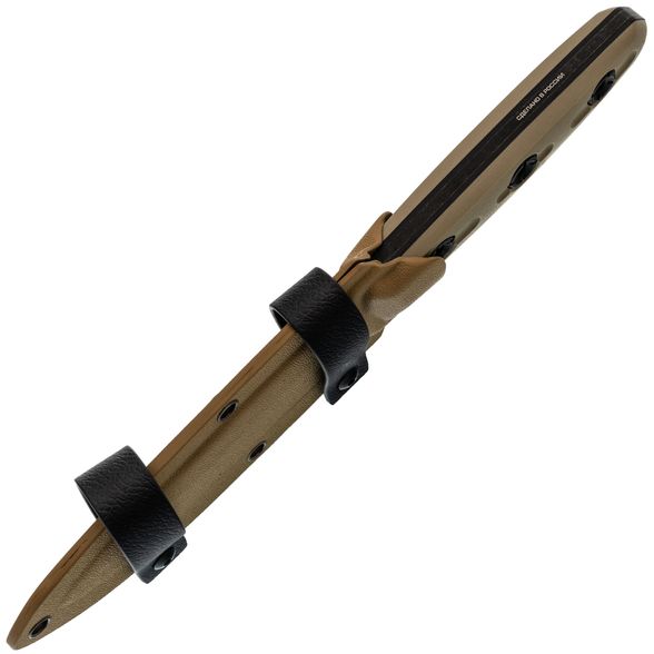 Ножны изготовлены из кайдекса, что обеспечивает их прочность и простоту в обслуживании. Они формуются под контур ножа, благодаря чему инструмент надёжно фиксируется и не выпадает. Комплектуются силиконовыми стропами для горизонтального ношения на ремне, при этом наличие люверсов позволяет устанавливать сторонние системы крепления.