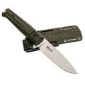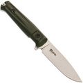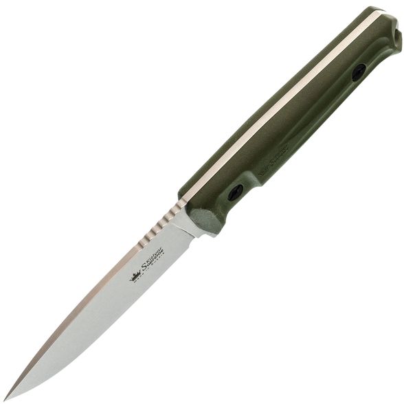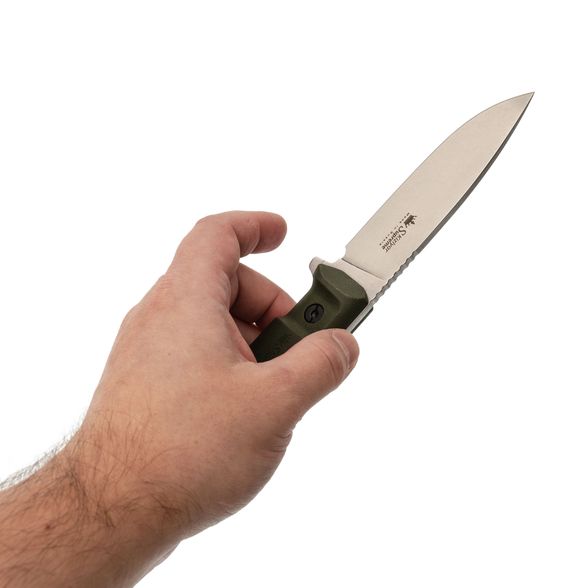 Клинок изготовлен из нержавеющей стали AUS-8, которая сочетает в себе высокую ударную вязкость и коррозионную стойкость. Такая сталь легко затачивается, что особенно важно в полевых условиях. Геометрия клинка типа Drop-Point с высокими прямыми спусками обеспечивает отличные режущие и строгающие характеристики, делая нож многофункциональным.