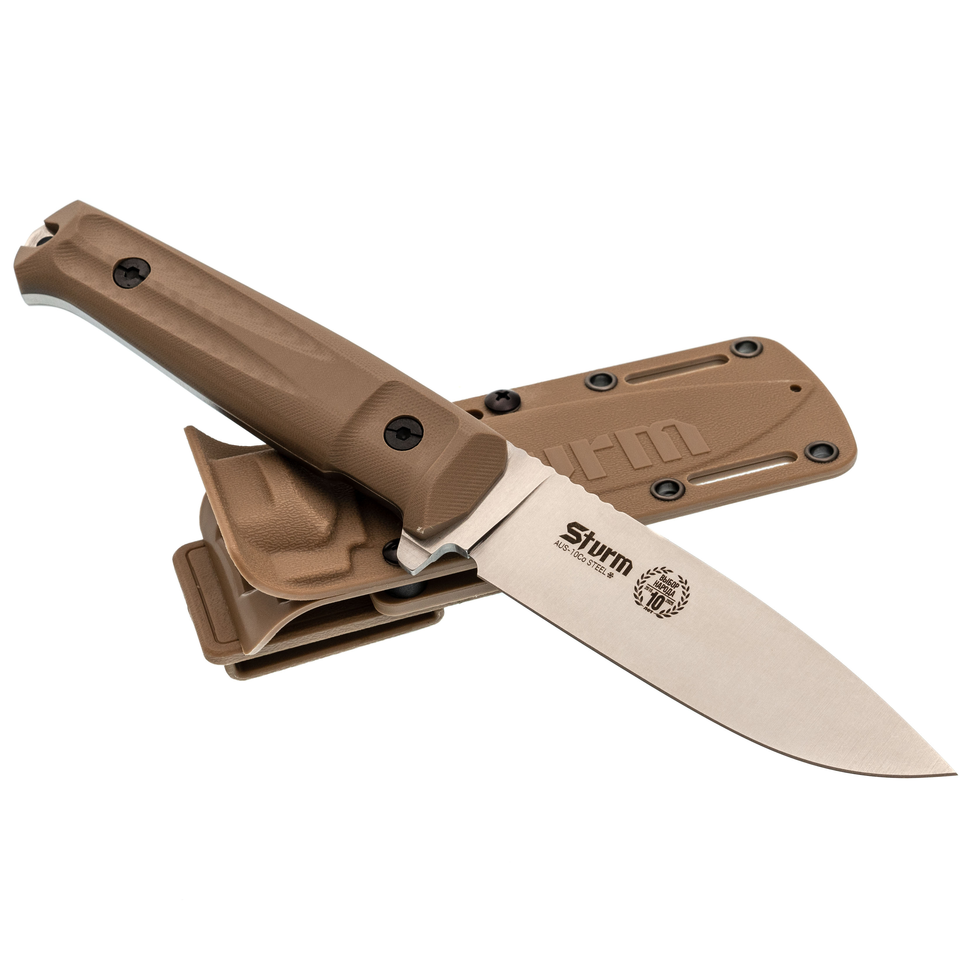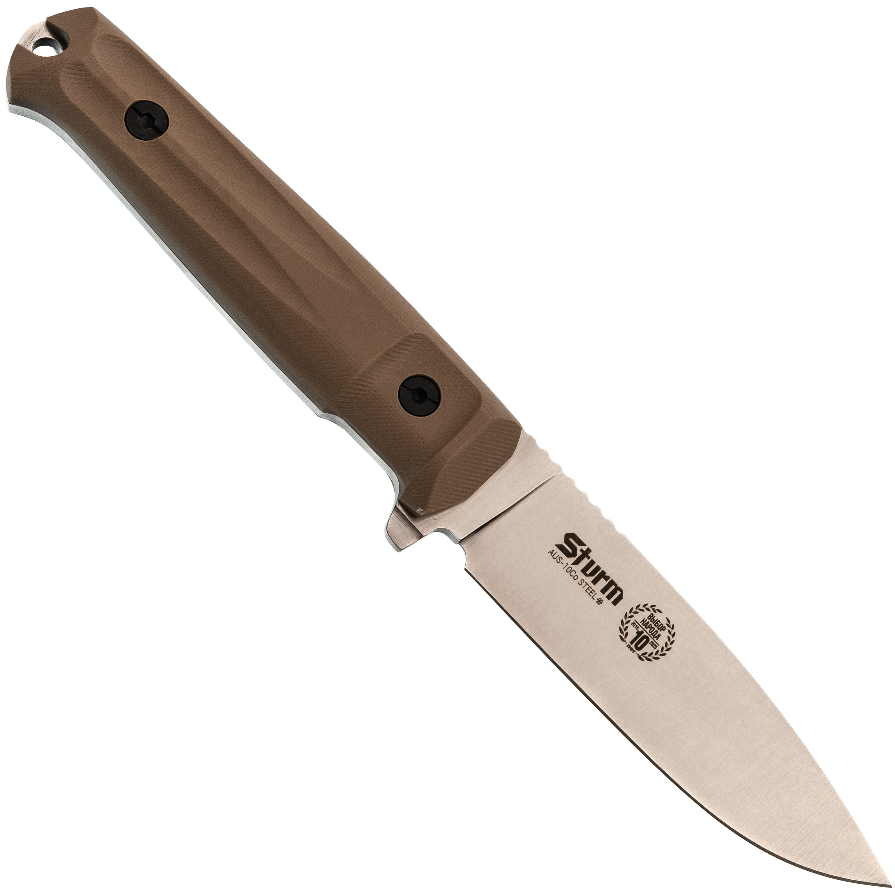 Sturm от Kizlyar Supreme - это прагматичный инструмент, созданный для тех, кто ценит надёжность без лишнего пафоса. Модель доказала свою эффективность: она заняла первое место в конкурсных испытаниях в номинации "Городской Тактический Нож" (клинок до 120 мм). В честь десятилетия линейки в 2025 году вышел юбилейный экземпляр в стали AUS-10Co (Cryo) с памятной медалью на лезвии и вариантом отделки "Пустыня" - знак того, что доступность и качественная обработка могут идти рядом с премиальными характеристиками.