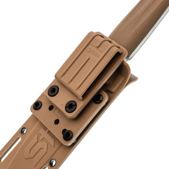 Чехол выполнен из специального полиамида: лёгкий, но с надёжным замком для фиксации в любом положении, включая ношение рукоятью вниз. Извлечение бесшумное - важное практическое качество для полевых условий. Платформа и съёмная клипса дают широкие варианты крепления: вертикально, горизонтально или по диагонали; возможна установка на ремень под разными углами и на MOLLE-системы. Такие решения позволяют адаптировать модель под личные предпочтения и снаряжение.