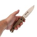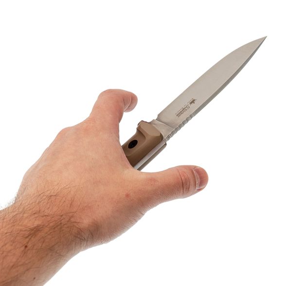 Рукоять в конфигурации Tactical Echelon разработана так, чтобы быть удобной как без перчаток, так и в перчатках: сужающаяся к тыльнику коническая форма, выразительная подпальцевая выемка и небольшая гарда обеспечивают надёжную посадку руки и предохраняют от соскальзывания. Накладки из G10 с вырезами по бокам добавляют сцепления и предотвращают проворачивание в руке; два углубления у навершия подчёркивают динамику форм и упрощают контроль при точных действиях. На тыльнике расположена закруглённая точка - стеклобой - оформленная так, чтобы не мешать хвату с упором ладони.