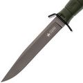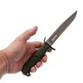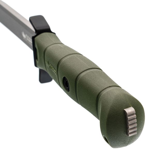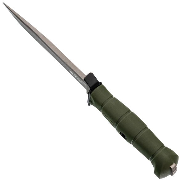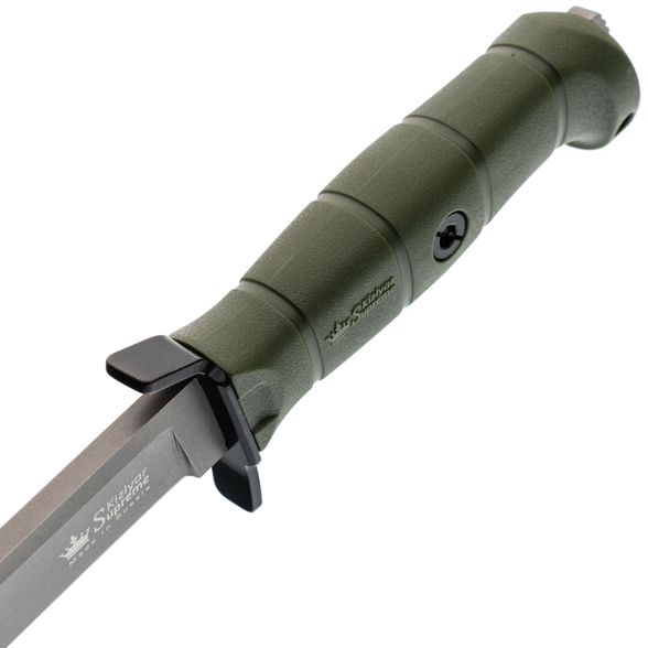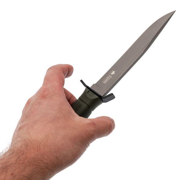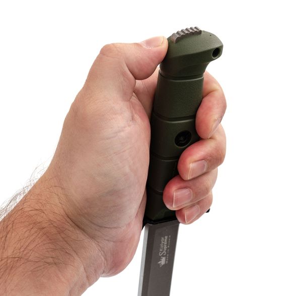 Рукоять выполнена из кратонового полимера с учётом анатомии ладони и сценариев тактического применения. Форма с выраженным "грибком" - отсылка к классическим финским решениям, обеспечивающим дополнительный упор. Развитые подпальцевые упоры расположены с обеих сторон, что гарантирует максимальную безопасность: рука остаётся под контролем даже при работе в перчатках или во влажной среде. В торце рукояти выступает хвостовик, пригодный для дробящих задач.