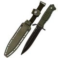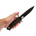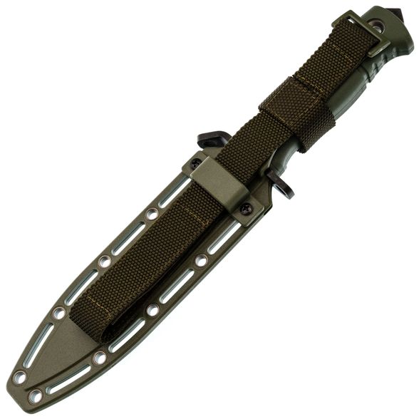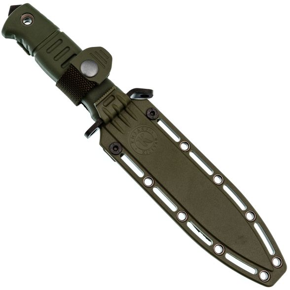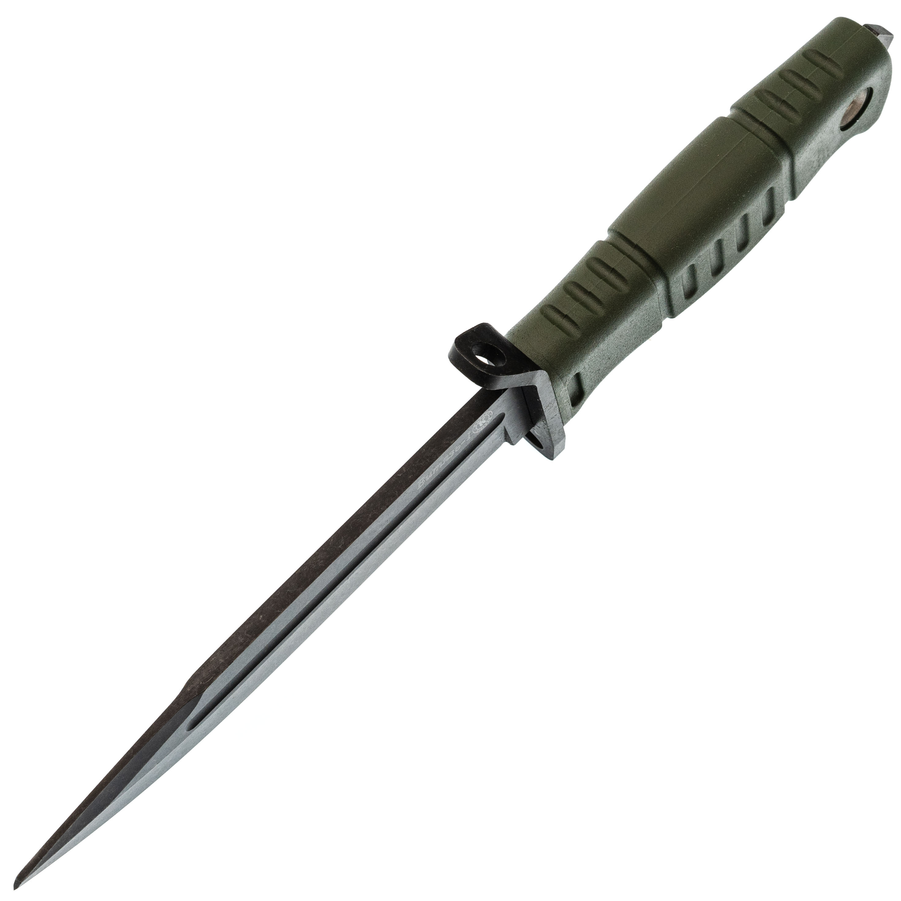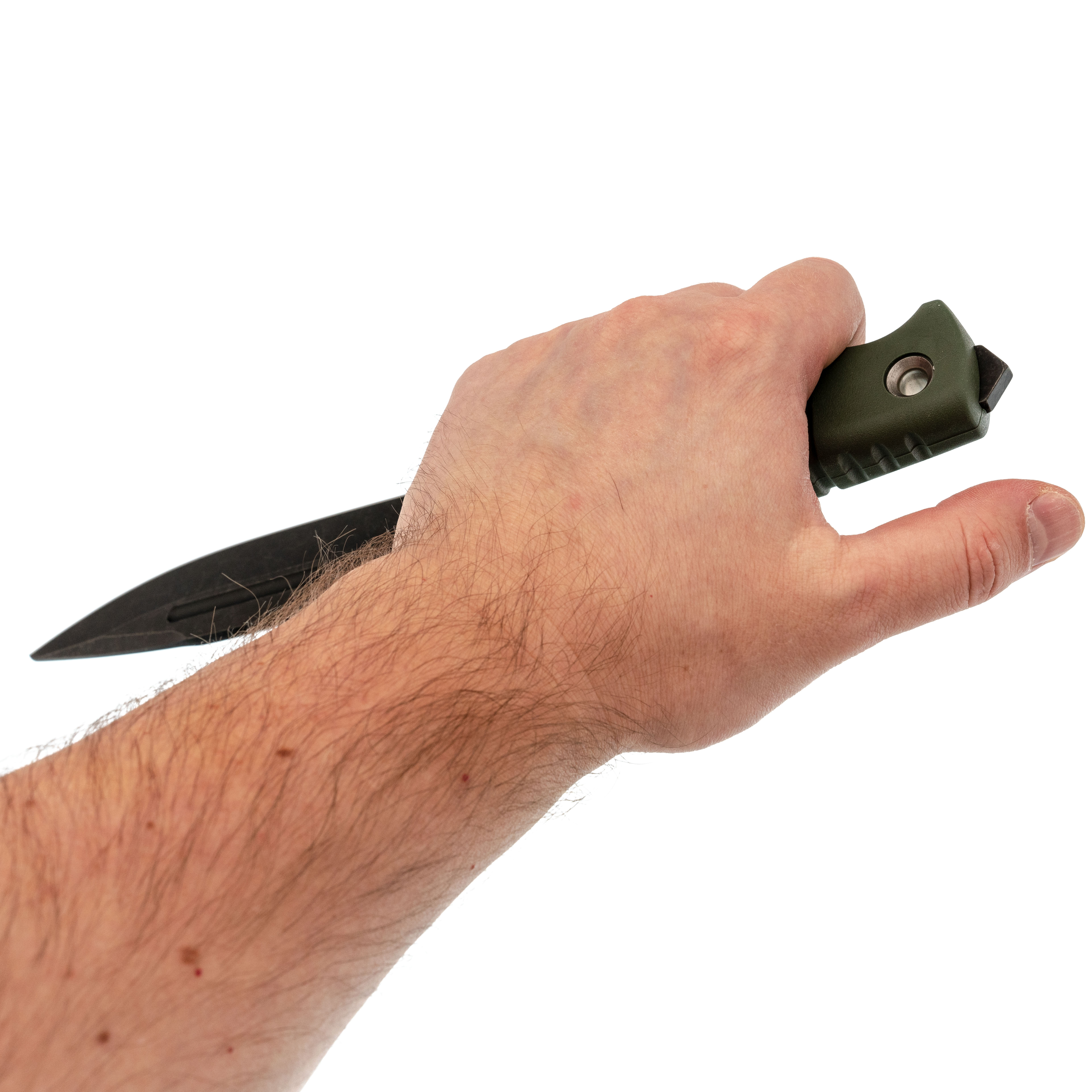 Рукоять из Elastron G в оливковом цвете удобно ложится в ладонь и даёт уверенный хват в перчатке и без неё. Крупные выраженные упоры надёжно страхуют руку при силовом резе. Сквозной монтаж добавляет запаса прочности, а выступающий хвостовик можно использовать как стеклобой - функциональный элемент, который всегда под рукой и не мешает при обычной работе.
