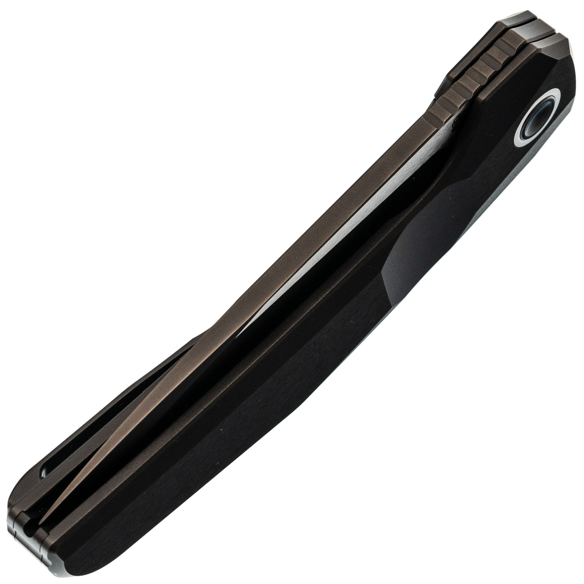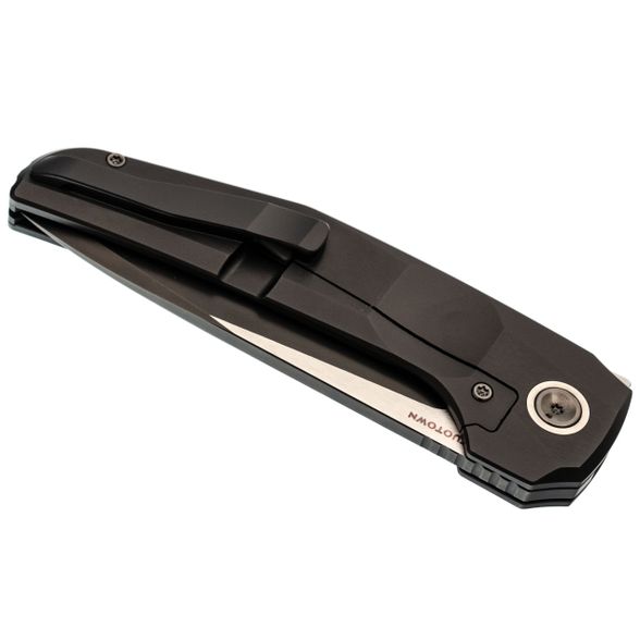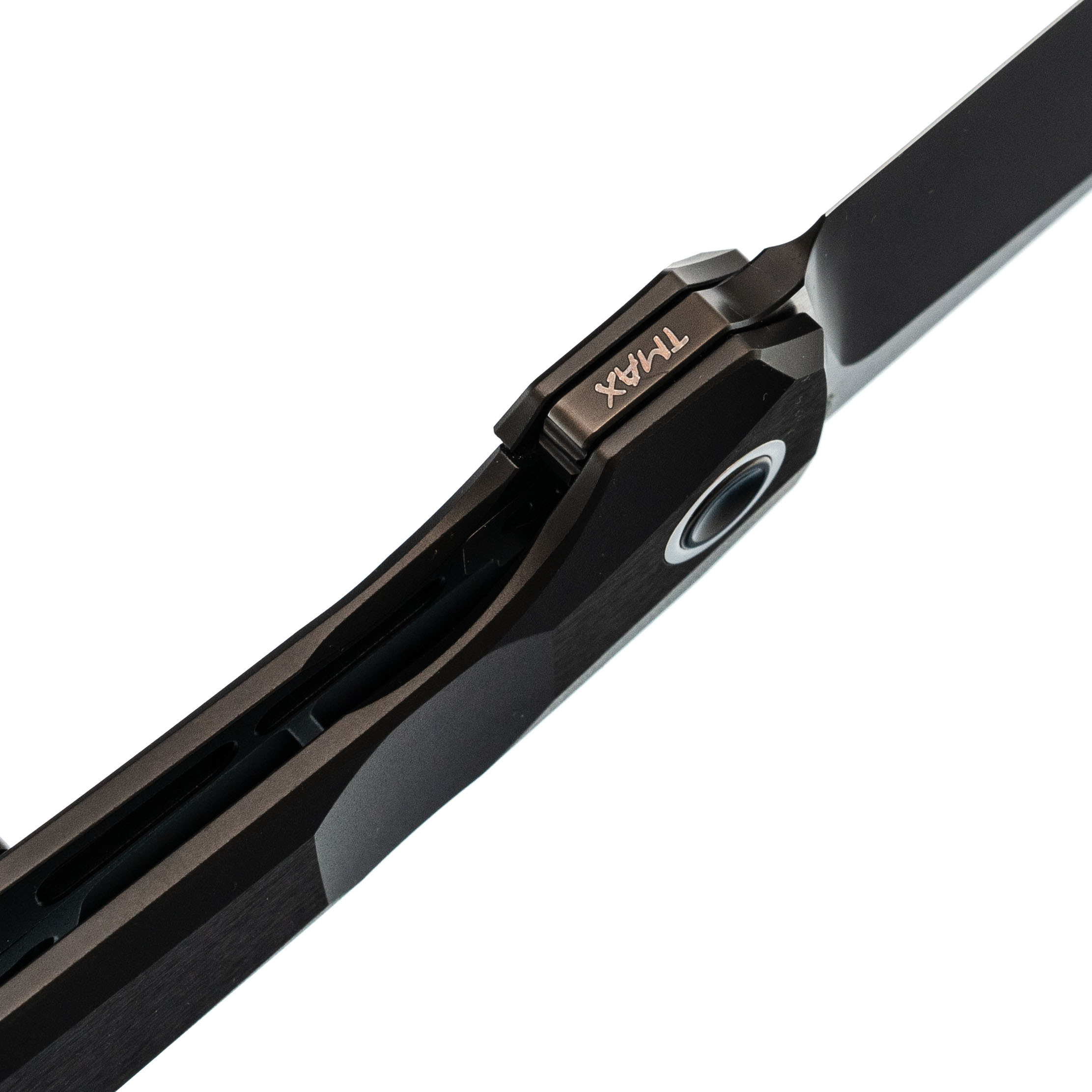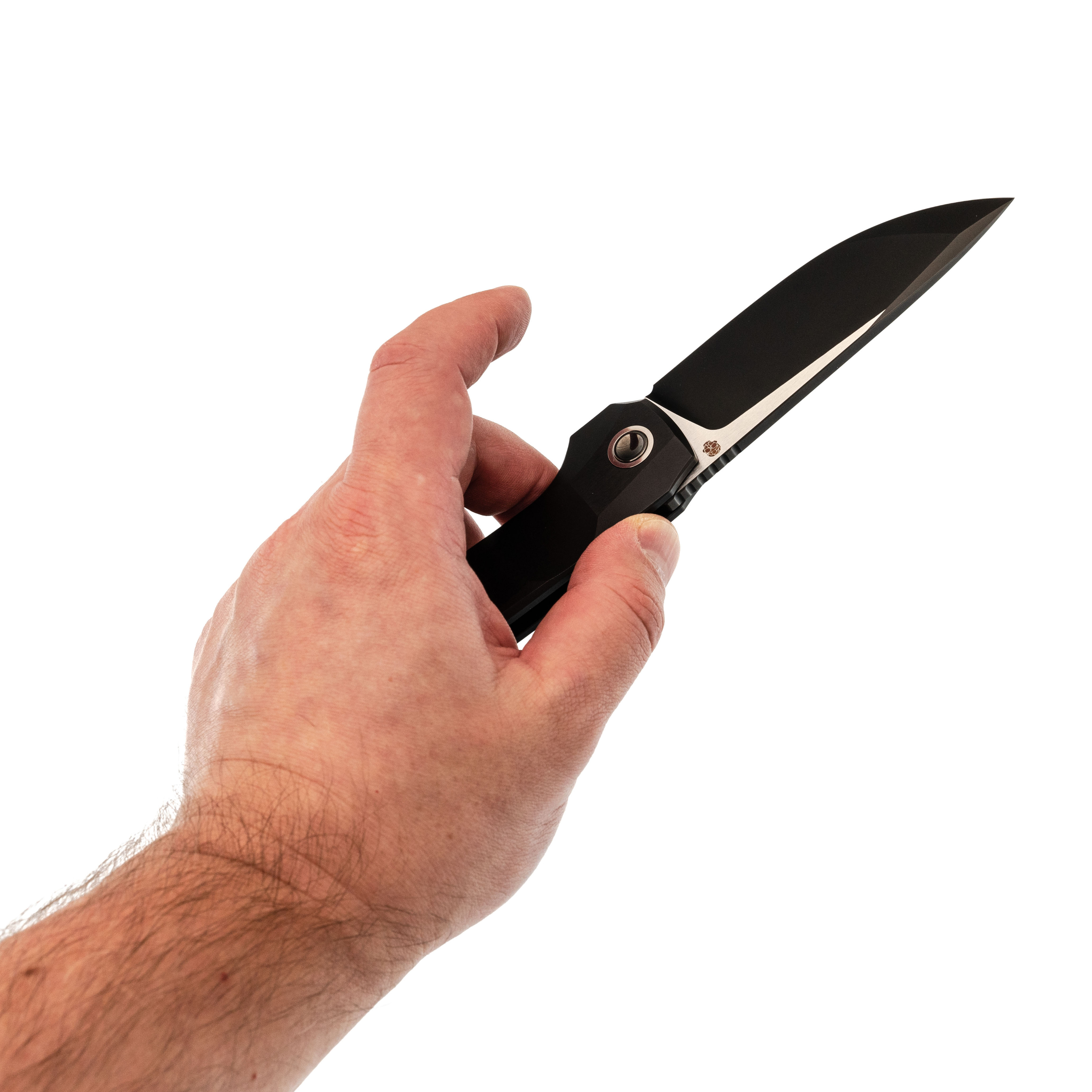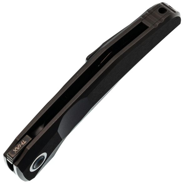 Рукоять сделана из титана и дополнена надёжным замком Frame-Lock. Она эргономичная и продуманная, чтобы комфортно лежать в руке. Для удобного ношения предусмотрена цельнофрезерованная титановая клипса, которая аккуратно фиксирует нож в кармане.