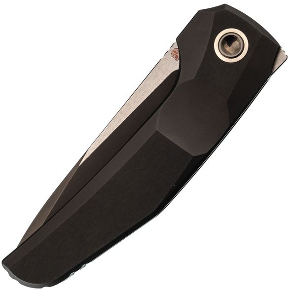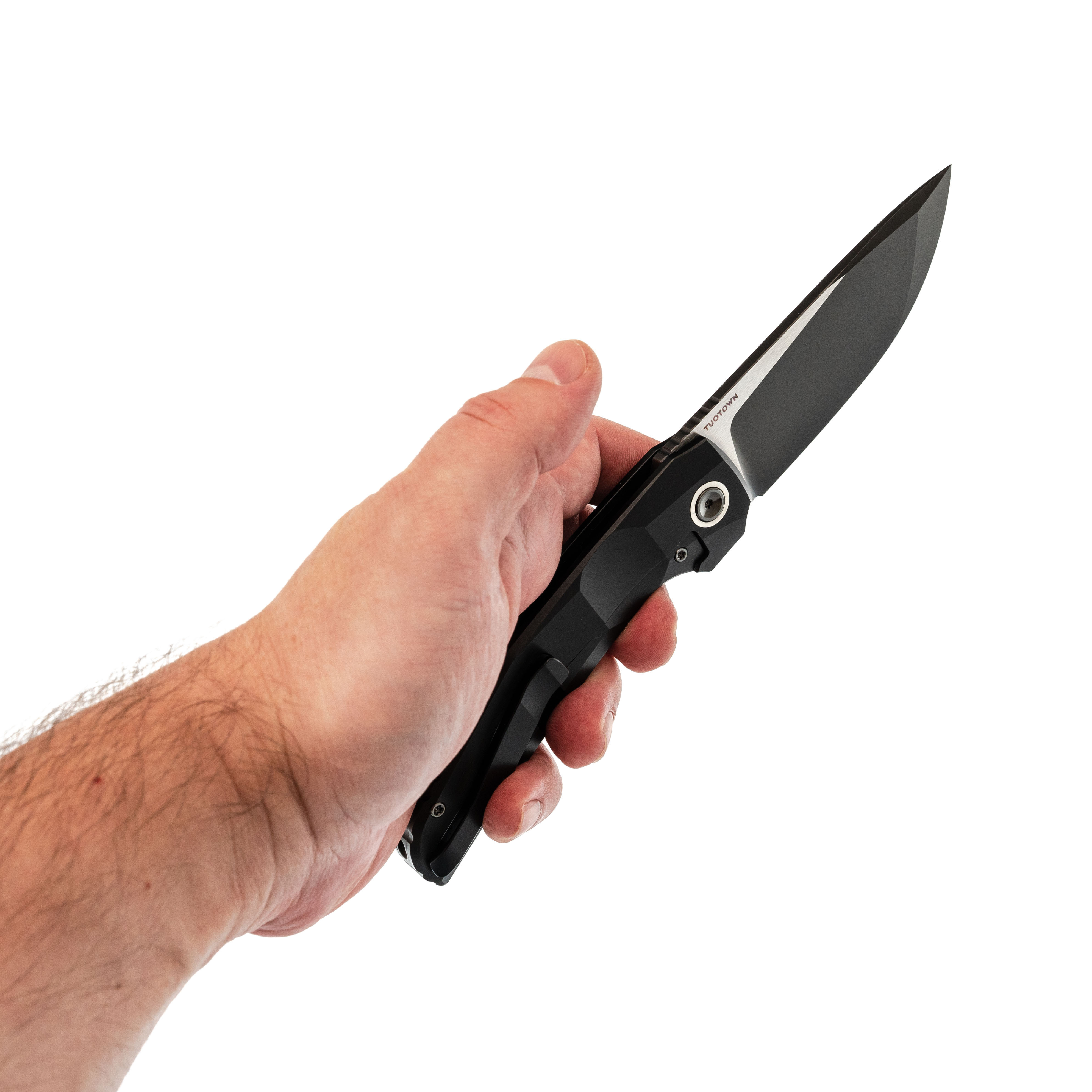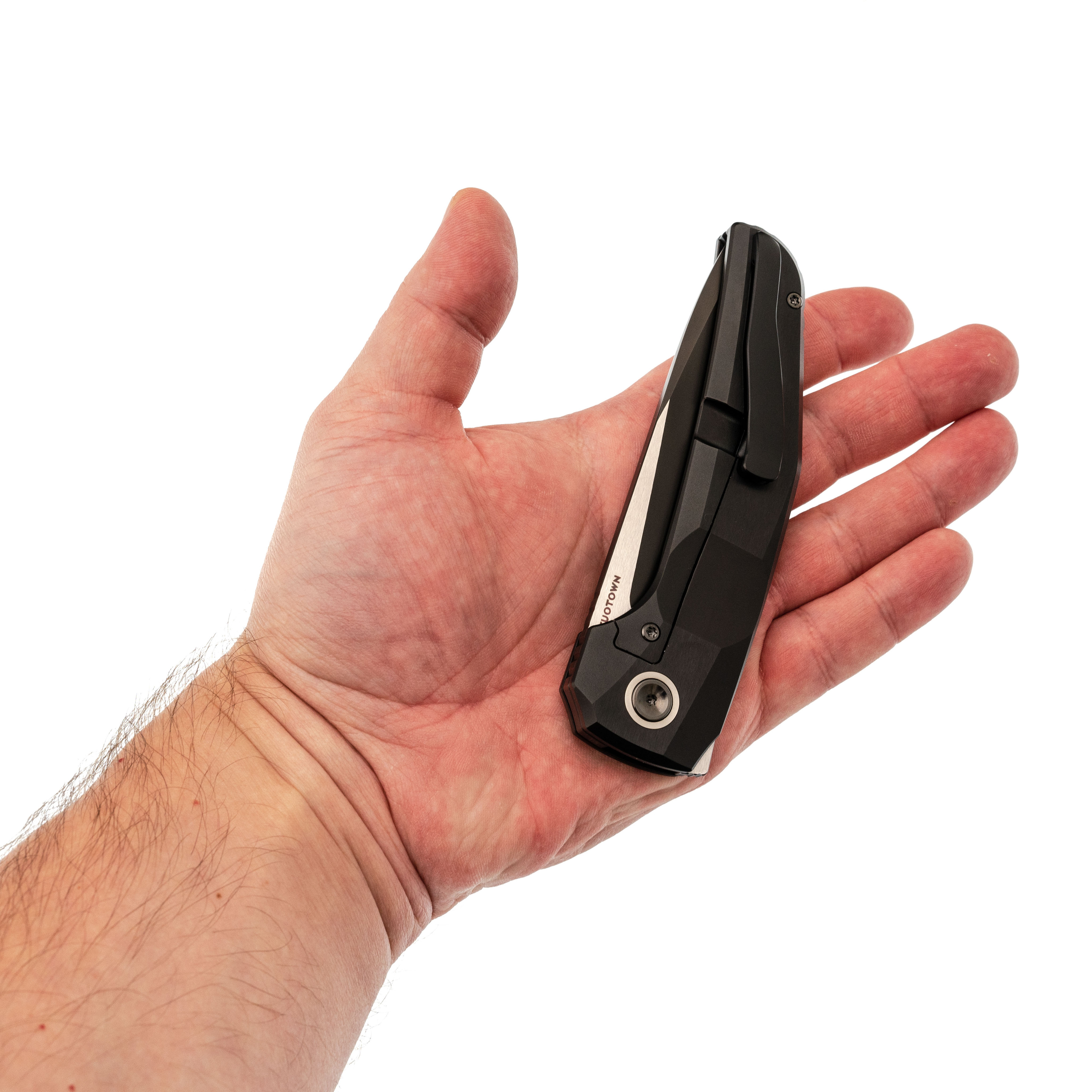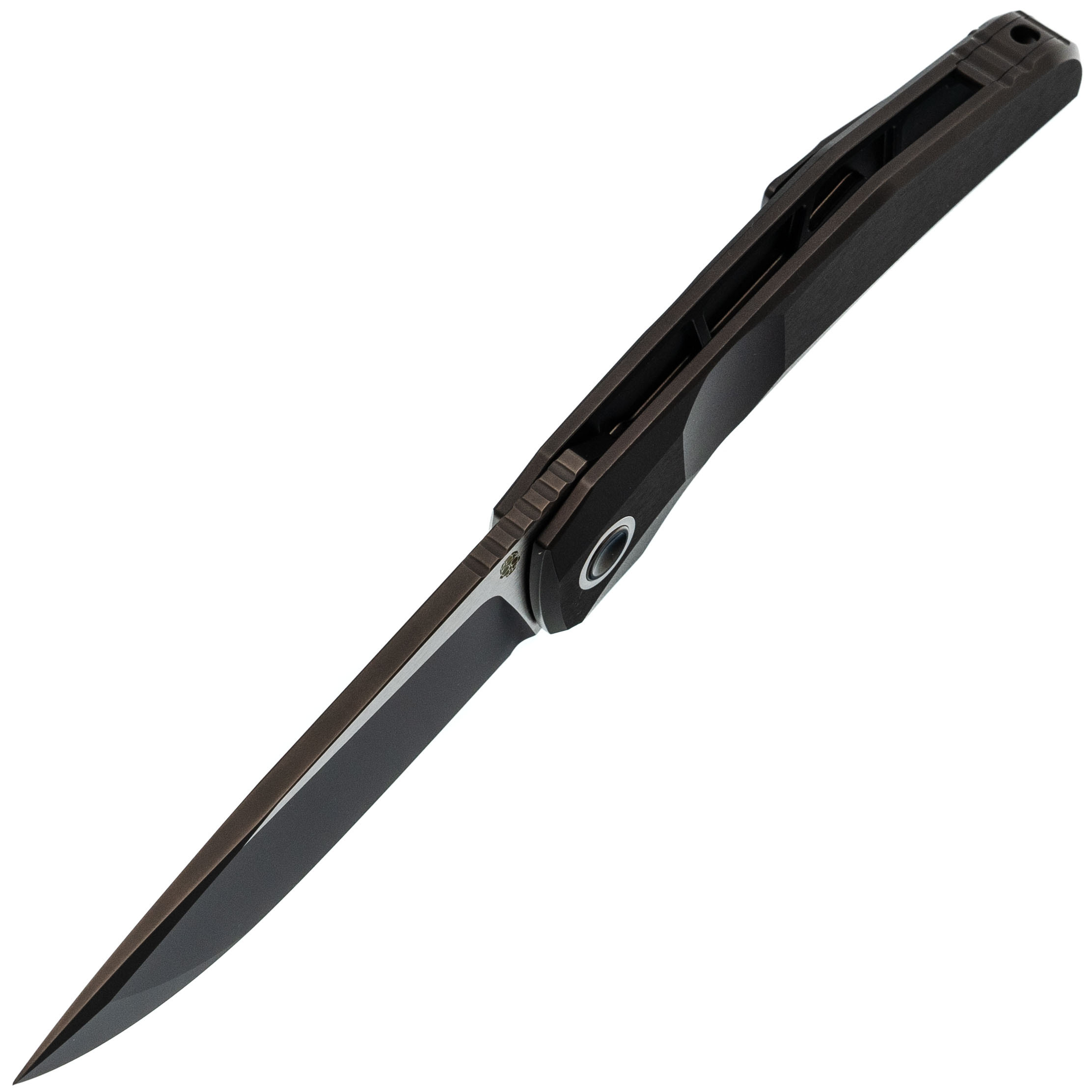 Рукоять сделана из титана и дополнена надёжным замком Frame-Lock. Она эргономичная и продуманная, чтобы комфортно лежать в руке. Для удобного ношения предусмотрена цельнофрезерованная титановая клипса, которая аккуратно фиксирует нож в кармане.