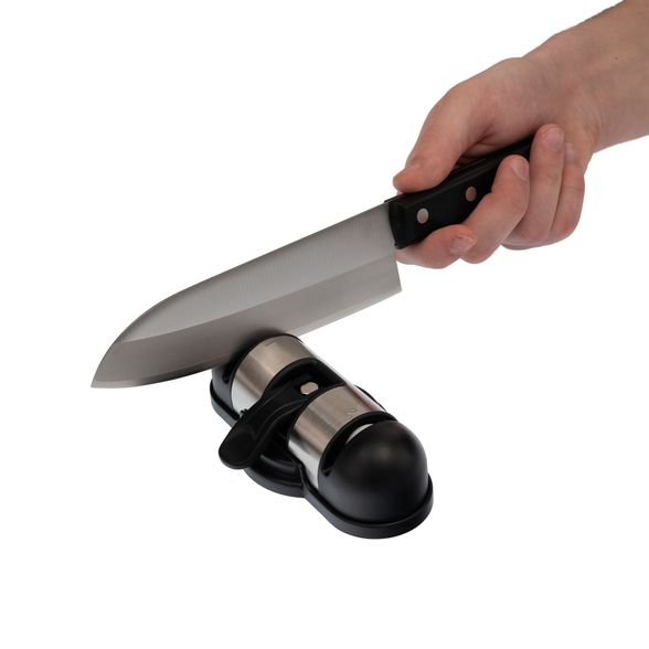 ТОЧИЛКА МЕХАНИЧЕСКАЯ ДЛЯ НОЖЕЙ ДЛЯ ГРУБОЙ И ДЕЛИКАТНОЙ ЗАТОЧКИ, НА ПРИСОСКЕ максимально простой, но при этом надежный аксессуар, который позволяет затачивать кухонные, хозяйственные и туристические ножи с твердостью до 56 HRC. Ножи такого типа достаточно легко поддаются обработке. Для безопасной работы точилка оснащена присоской, которая фиксирует ее на любой ровной поверхности. Точилка имеет два V-образных элемента для грубой и финишной обработки режущей кромки.