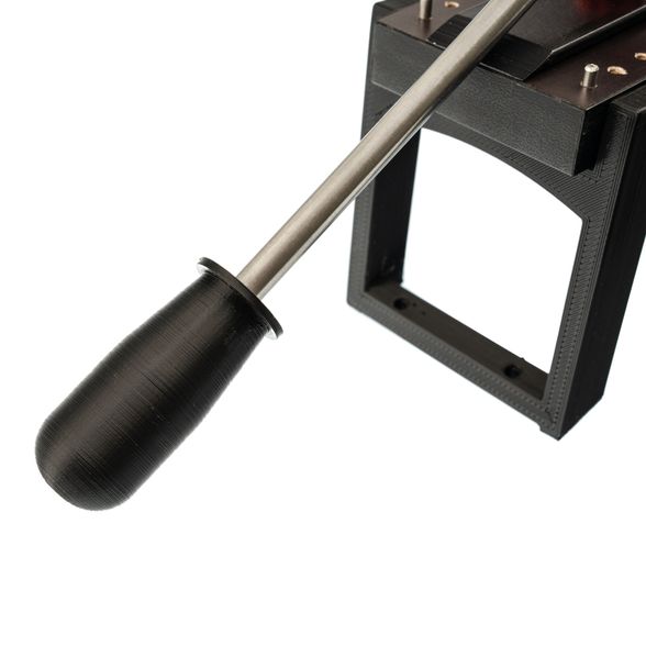 Жесткое крепление лезвия ножа в одной позиции. Конструкция фиксатора состоит из нескольких деталей, выполненных из металла. Зажим лезвия происходит винтом с красным барашком, которыми комплектуют ручные прессы.