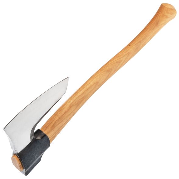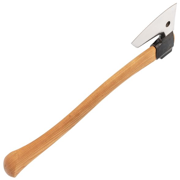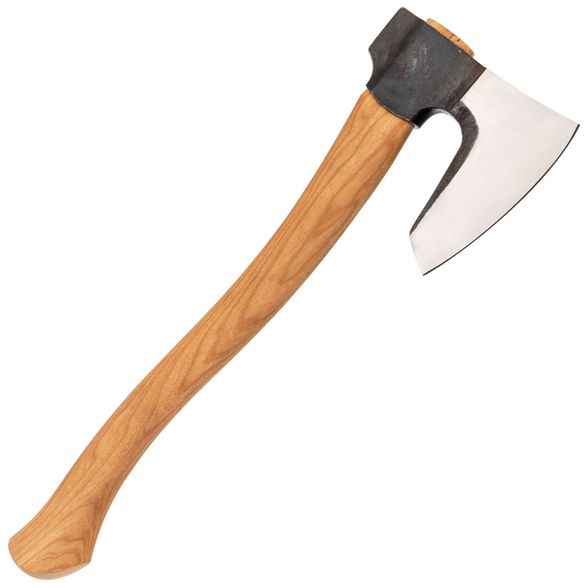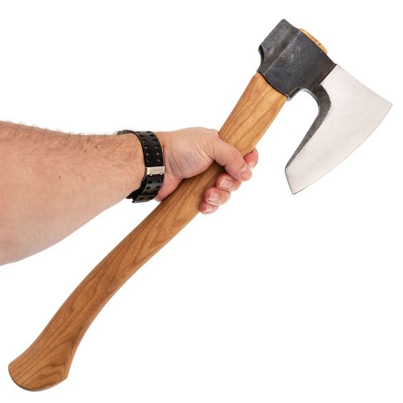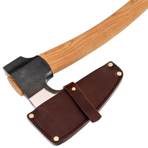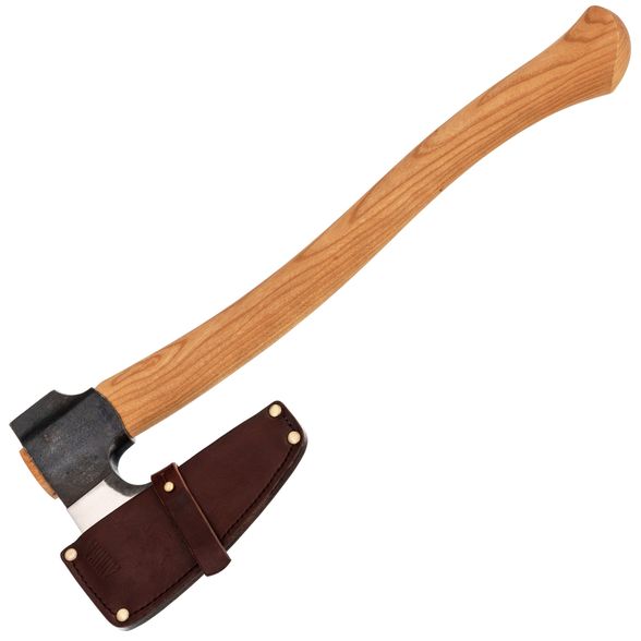 Рукоятка из твердого и сухого ясеня обеспечивает высокий запас прочности и удобство в использовании. Плотницкие технологии обработки рукоятки позволяют ей легко ложиться в руку и не вызывать усталость даже при длительном использовании. Топор также комплектуется резными ножнами из качественной кожи, которые обеспечивают защиту режущей кромки и удобство транспортировки.