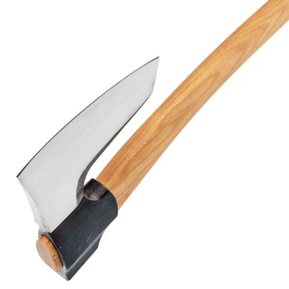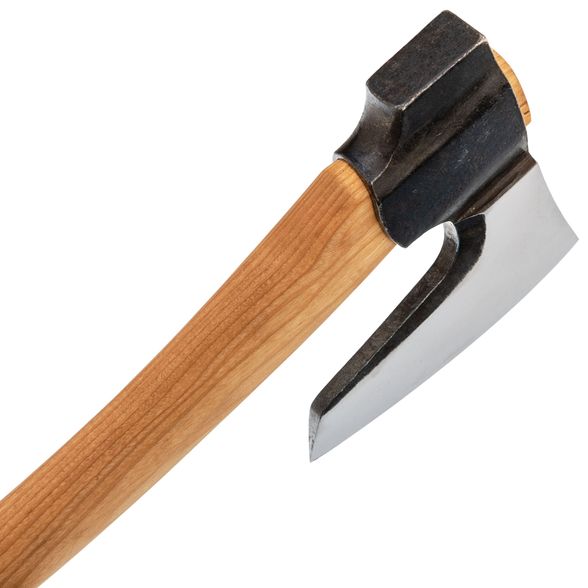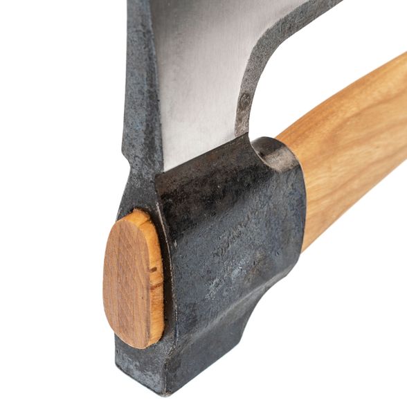 Голова топора выполнена из высокотвердой кованой технологичной стали, которая обладает грамотно подобранным набором элементов из различных металлов. Это наделяет сплав оптимальным соотношением между твердостью, упругостью и ударной вязкостью. Тыльная часть головы имеет плоскую поверхность для использования в качестве кувалды или молотка, что делает этот инструмент особенно многофункциональным.
