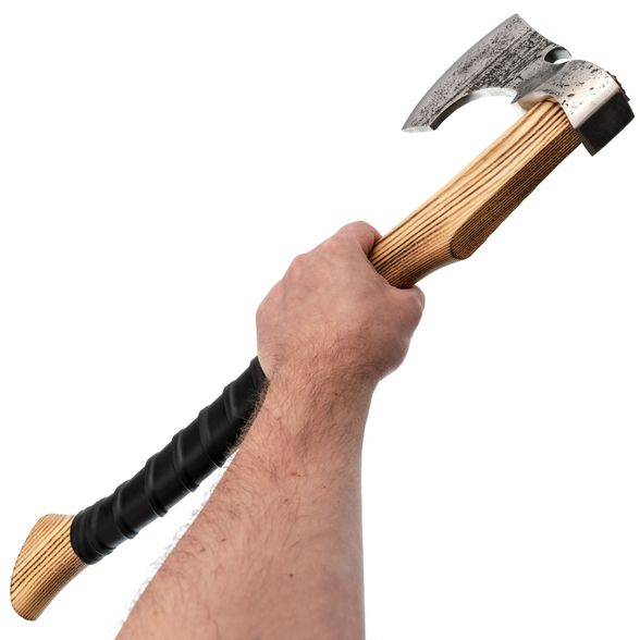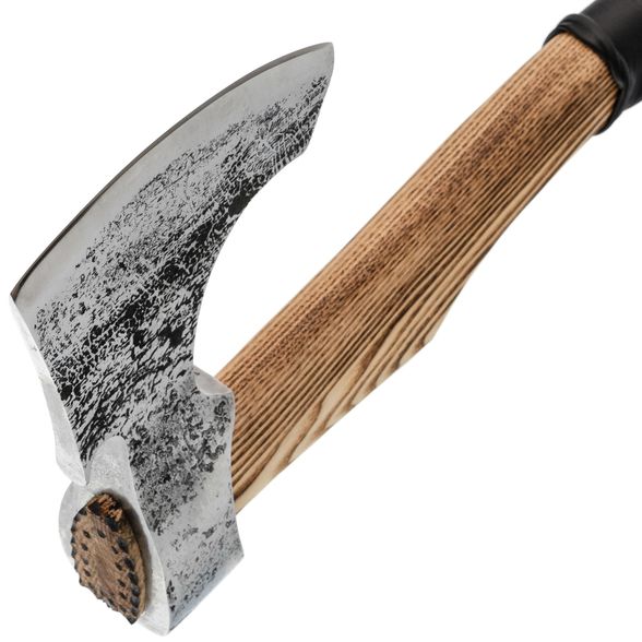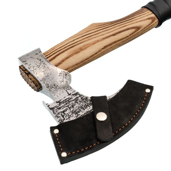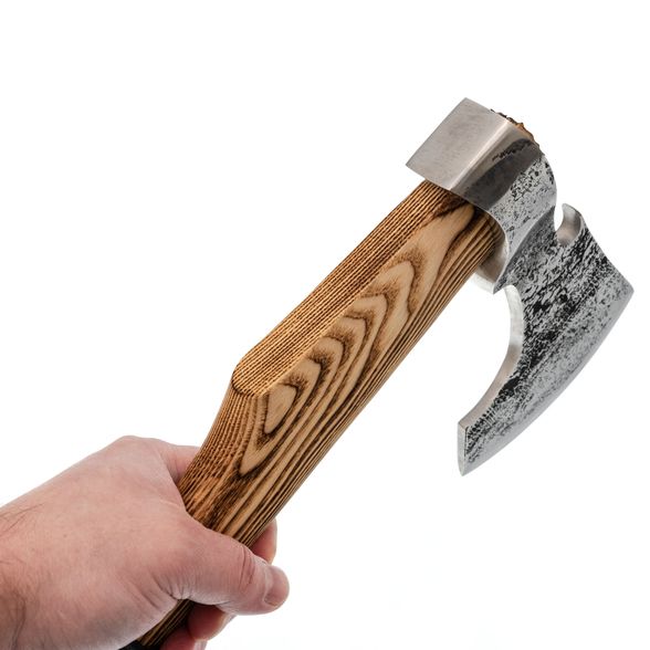 Рукоять изготовлена из ясеня — это прочная и долговечная древесина с красивой текстурой. Она имеет эргономичную форму, что позволяет удобно держать топор разными хватами, будь то мощный замах или аккуратная работа по дереву. Благодаря обоженнию и морению ясень устойчив к влаге, а значит, рукоять не рассыхается и не коробится.