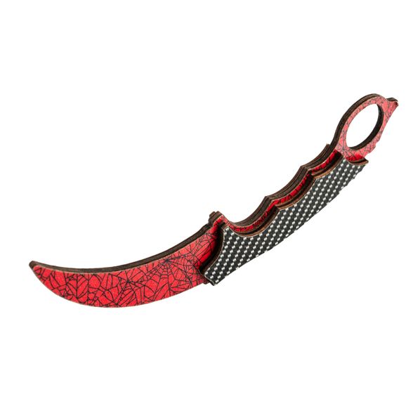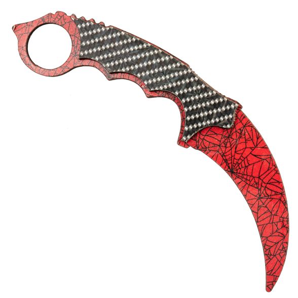 Тренировочный Керамбит Паутина, красный - замечательный подарок для любителей восточных боевых искусств. Данное изделие обычно держится обратным хватом с продеванием пальца в специальное кольцо. Выполнен этот нож из фанеры, которая хорошо зашлифована, а острые части ножа имеют закругленные края. Изогнутое лезвие напоминает клык тигра, что непременно придется по вкусу юным бойцам. Рукоять имеет текстурированную поверхность, позволяющую хорошо фиксировать изделия в ладони. А яркая, стилизованная под паутину поверхность, сделает нож-керамбит Кровавая Паутина КС ГО предметом гордости и желанным подарком к любому празднику.