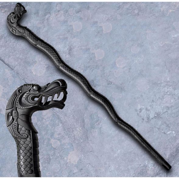 Трость - Dragon Walking Stick до мельчайших деталей имитирует голову дракона из скандинавских легенд и мифов, и придется по вкусу ценителям эксклюзивных вещей под старину. Ее дизайн разработан на основе антикварной резной деревянной трости. В отличие от своего прототипа, для данного изделия использован ударопрочный полимер, который выдерживает сильнейшие нагрузки. Поэтому данная трость относится к разряду тактических. Выберите стильную трость хищный дракон в нашем интернет-магазине для себя или в подарок любителю неординарных креативных вещей.