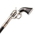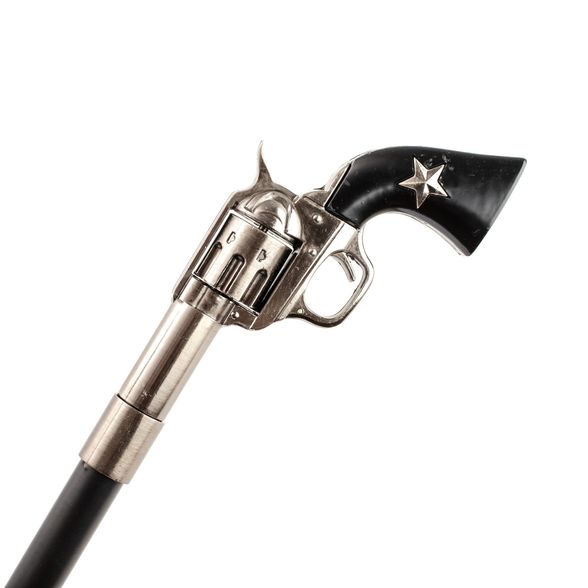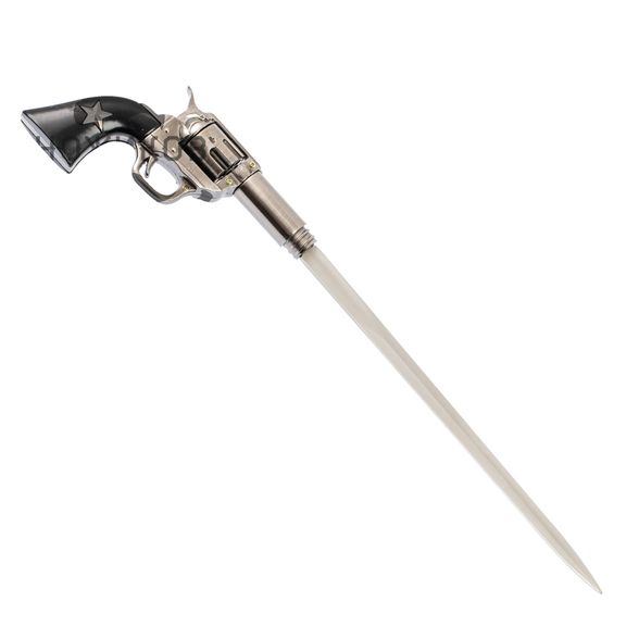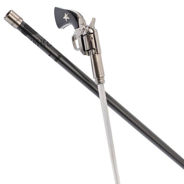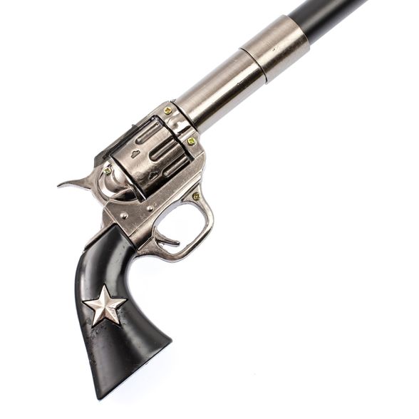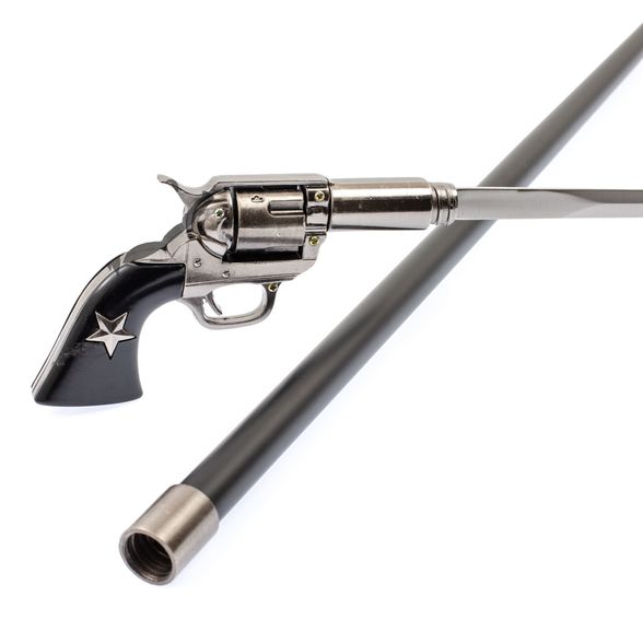 Ствол трости - это стальная тонкостенная труба, покрытая матовой черной краской. Она заканчивается металлическим утолщением, на которое надета резиновая насадка. Алюминиевая рукоять превосходно имтирует классическией револьвер Кольт и при этом имеет достаточно удобный хват. Открутив ее по широкой резьбе, вы извлечете стальной клинок стилетного типа длиной 28,5 см. Трость с клинком револьвер станет отличным презентом как для стильных мужчин, желающих придать имиджу изюминку, так и для коллекционеров необычного холодного оружия.