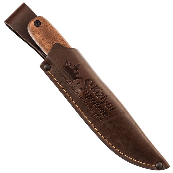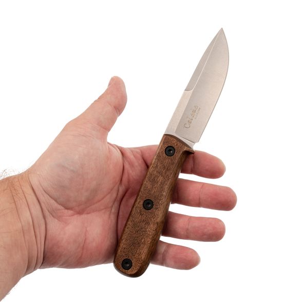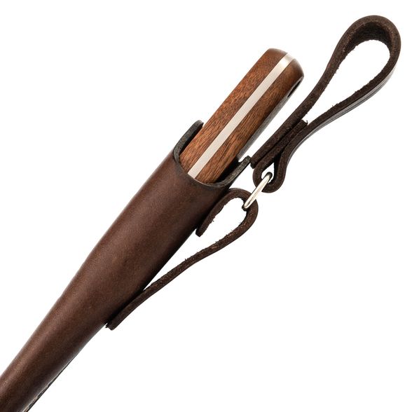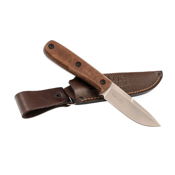 Рукоятка ножа изготовлена из натурального орехового дерева, что придает инструменту не только привлекательный внешний вид, но и комфорт в использовании. Компактный размер ножа и продуманная форма делают его удобным для ежедневных задач, будь то разделка пищи или работы с различными материалами.