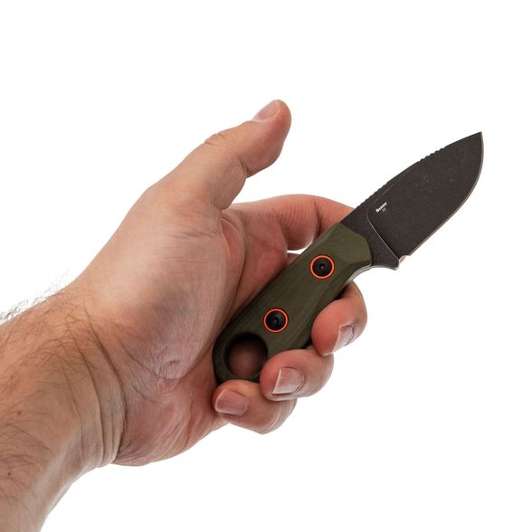 Цельнометаллический монтаж Full-Tang делает конструкцию особенно прочной и устойчивой к нагрузкам. Рукоять из стеклотекстолита G10 обеспечивает ножу уверенный хват даже во влажных условиях. Этот материал ценится за стойкость к химии, влаге и температурным колебаниям. Эргономичная форма рукояти удобно заполняет ладонь, а скосы на ней дают возможность уверенно взять нож в "поварский" хват для точной работы.