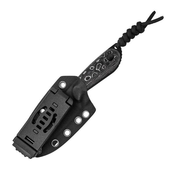 В комплект входят прочные и надежные ножны из Kydex, которые обеспечивают надежную фиксацию ножа, даже если он находится рукоятью вниз. Ножны оснащены креплением типа Tek-Lok, что позволяет носить нож как горизонтально, так и вертикально на поясе. Кроме того, благодаря множеству люверсов, нож можно удобно прикрепить к различным системам крепления, включая паракорд, шок-корд или цепочку для ношения на шее. Это делает модель универсальной и удобной для разных сценариев использования.