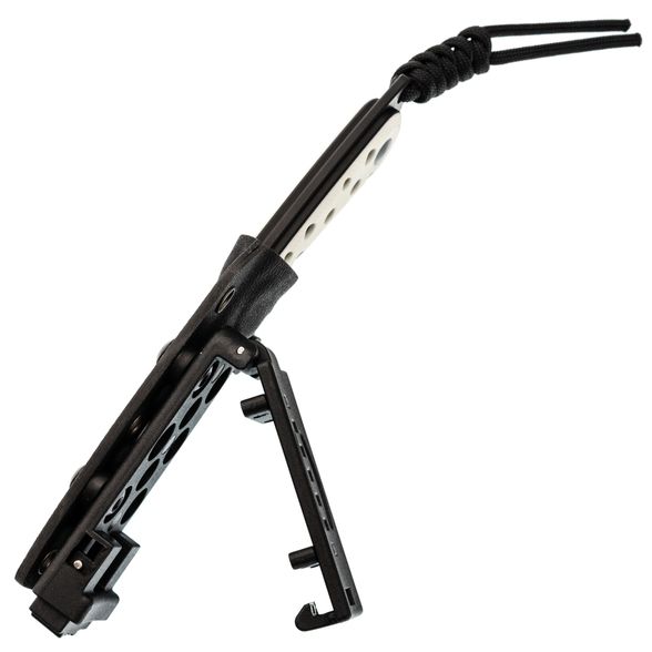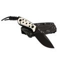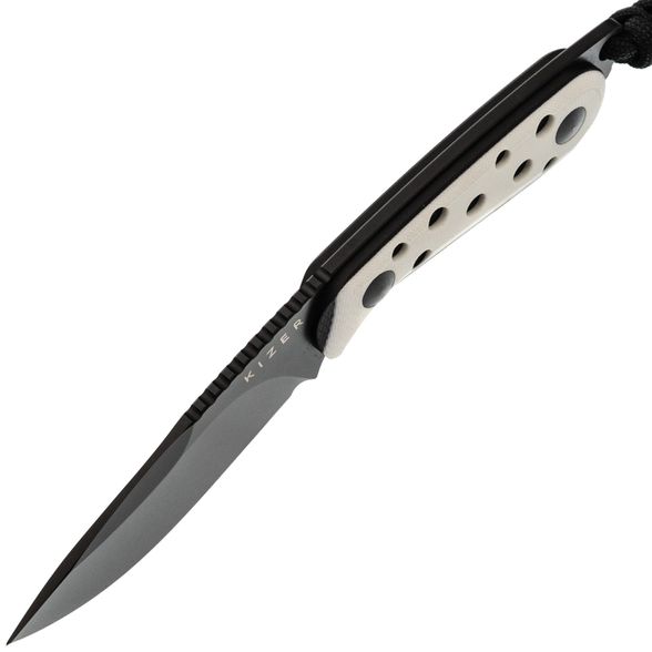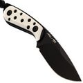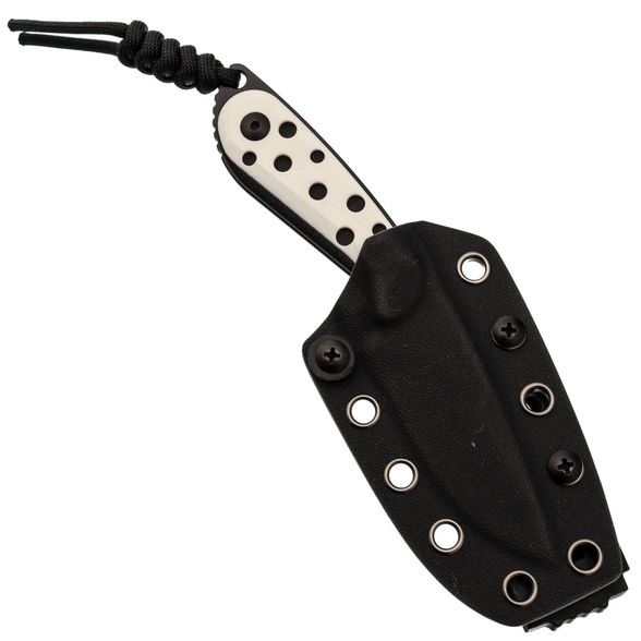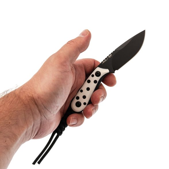 Рукоять из G10 черного и белого цвета: G10 - это прочный композит из слоёв стеклоткани, пропитанных эпоксидной смолой. Он устойчив к влаге, ударам и перепадам температур. Черно-белая цветовая комбинация придаёт рукояти стильный и современный вид, одновременно обеспечивая хорошее сцепление с рукой.
