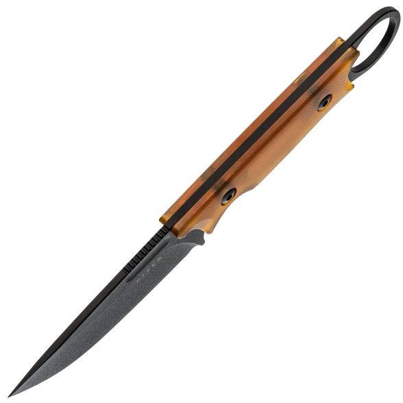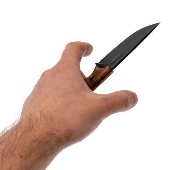 Накладки на рукояти выполнены из термопластика PEI (Ultem) — лёгкого, прочного и термостойкого материала, обладающего высокой устойчивостью к химическим и механическим воздействиям. Форма рукояти разработана с учетом анатомии ладони, что гарантирует удобный и безопасный хват даже при длительной работе. Керамбитное кольцо на конце рукояти добавляет дополнительный контроль и комфорт при удержании, особенно в сложных положениях.