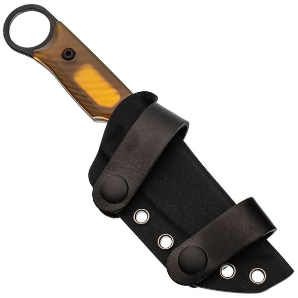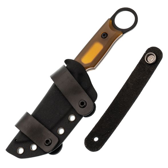 Ножны изготовлены из износостойкого и влагостойкого материала Kydex, который не боится перепадов температур и внешних воздействий. Он плотно удерживает нож, не давая ему выпадать при движении. Комплектные стропы позволяют надёжно закрепить нож горизонтально на поясе, обеспечивая быстрый и удобный доступ в любых условиях.
