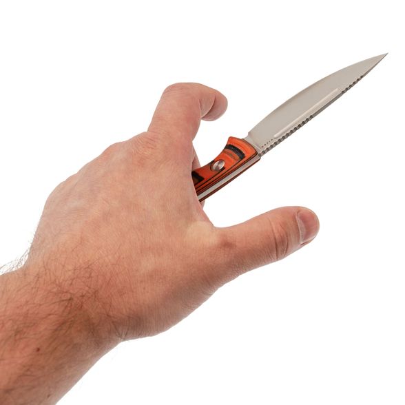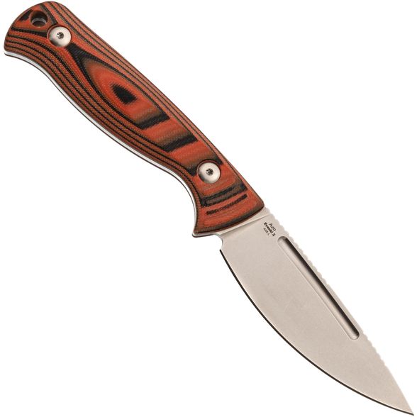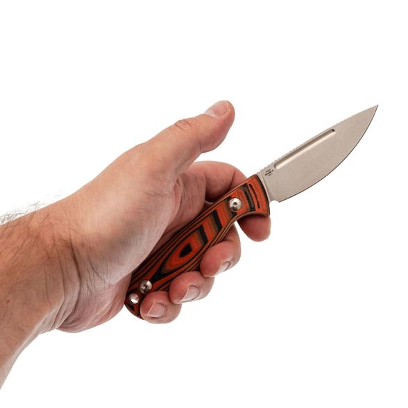 Профиль Drop-Point с выраженным изгибом режущей кромки обеспечивает лёгкость протяжного реза, что особенно ценно при обработке продуктов и разделке трофеев. Острый, деликатный кончик позволяет выполнять точные работы и аккуратно поддевать или прокалывать различные материалы. Прямые спуски от тонкого обуха снижают сопротивление при резе, облегчая работу как с мягкими, так и с плотными объектами.