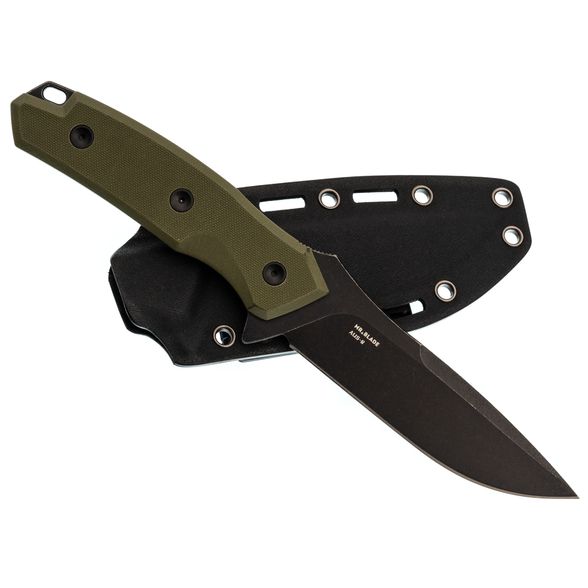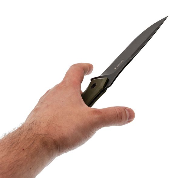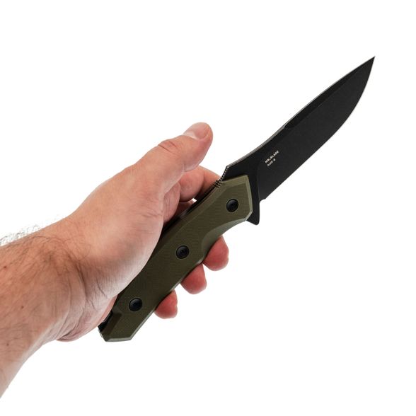 Рукоять из G10: композитный материал на основе стекловолокна и эпоксидной смолы, известный своей высокой прочностью, стойкостью к воздействию влаги и механическим повреждениям. Отличается лёгким весом и цепкой текстурой, которая гарантирует надёжный захват.