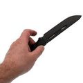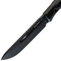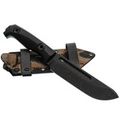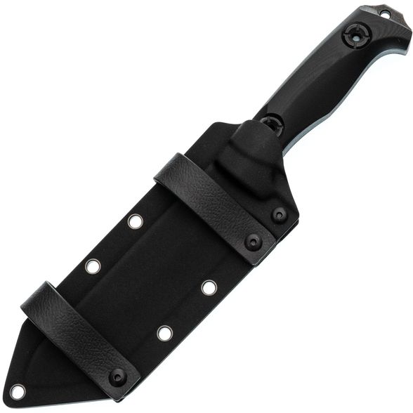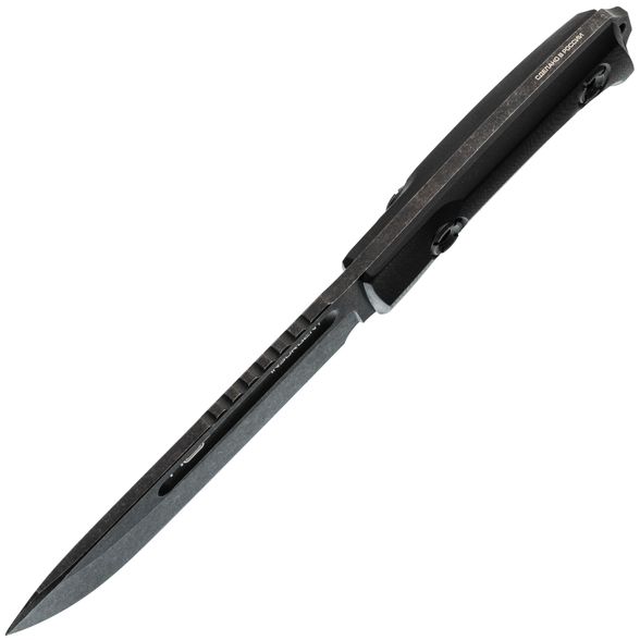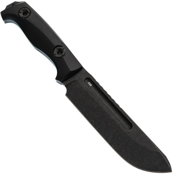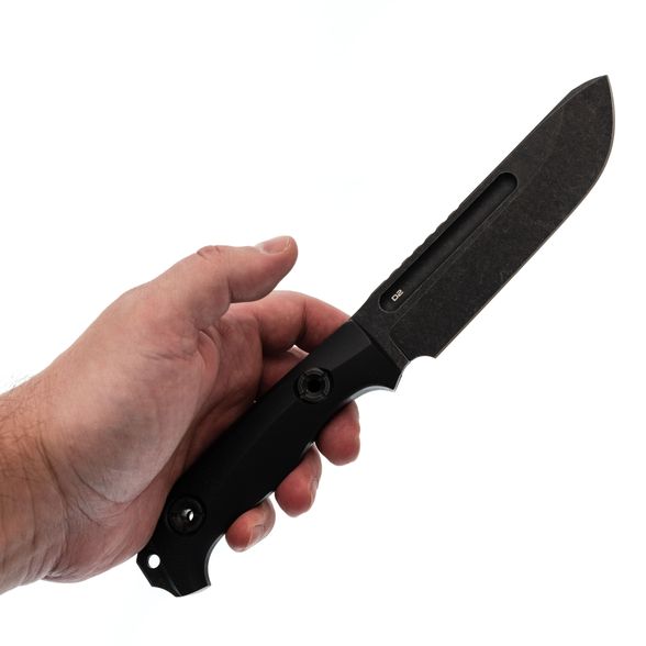 Рукоять, выполненная из черного стеклотекстолита G10, обеспечивает идеальное сочетание прочности, легкости и устойчивости к воздействию окружающей среды. Форма рукояти тщательно продумана для комфортного и надежного хвата, а большой упор защищает руку от скольжения. Монтаж рукояти накладной, что гарантирует максимальную прочность: стальная пластина с навершием образует основу, на которую крепятся накладки. Навершие с продолжением хвостовика образует скулкрашер, позволяя использовать нож для ударных задач.