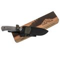 Клинок изготовлен из стали AUS-10, известной своей стойкостью и способностью сохранять заточку. Такая сталь обеспечивает оптимальное сочетание твердости и коррозионной стойкости. Клинок имеет толщину 5 мм с линейными спусками от середины, что придает ему невероятную прочность, но несколько ограничивает режущие способности. Обработка Stonewash придает клинку привлекательный внешний вид и скрывает следы использования.