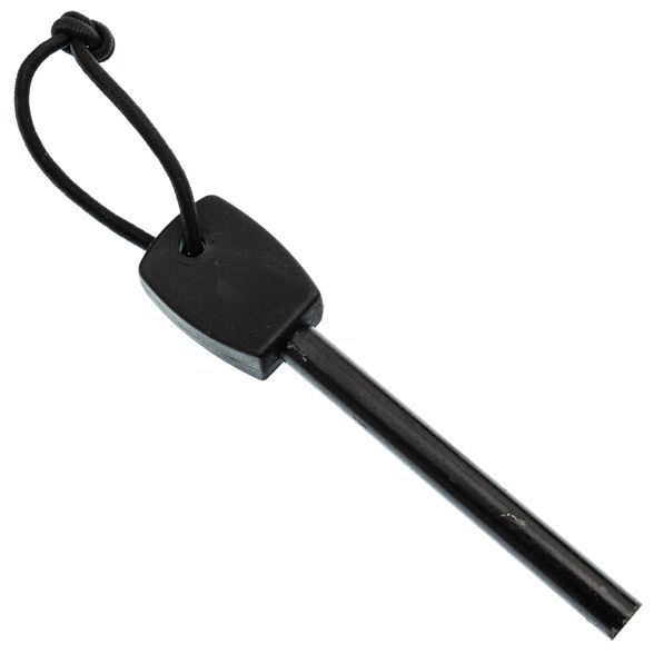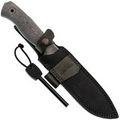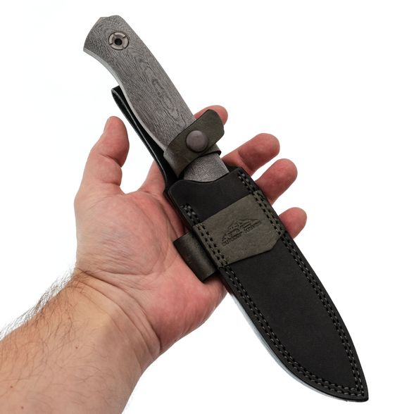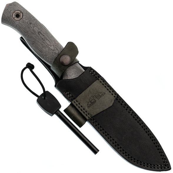 Ножны из натуральной кожи с жестким подвесом и хлястиком надежно фиксируют нож. Они удобны в ношении и обеспечивают быстрый доступ к ножу. В комплекте также идет огнив, которое крепится к ножнам при помощи резинки, что делает этот нож отличным выбором для выживания в дикой природе.