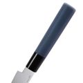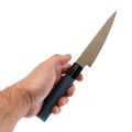 Круглое сечение рукояти равномерно заполняет ладонь. Нож не давит и не требует привыкания, удобно работать разными хватами. Баланс спокойный, без завала вперёд или назад - рука меньше устаёт при длительной готовке.