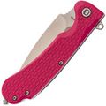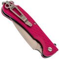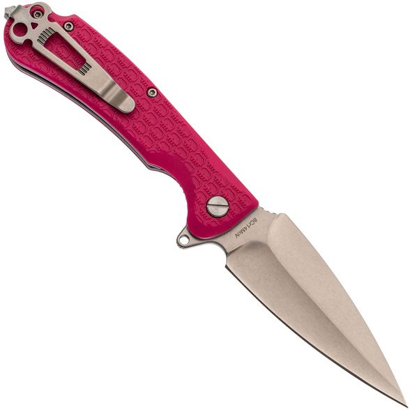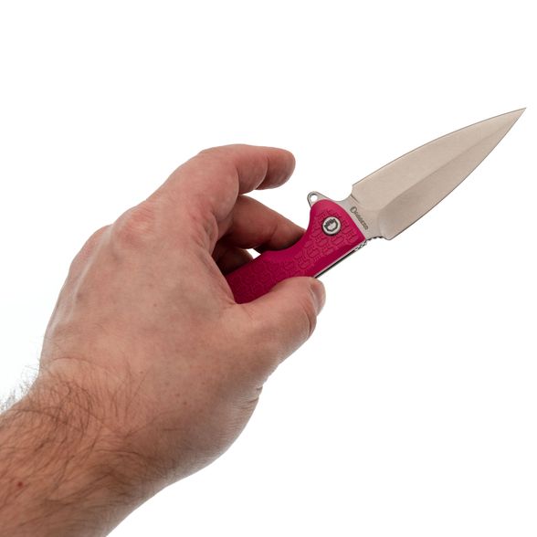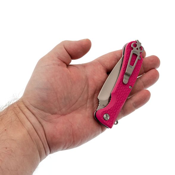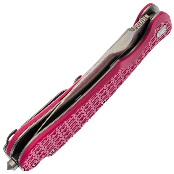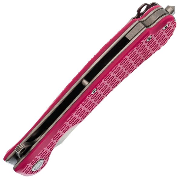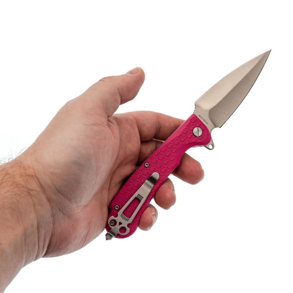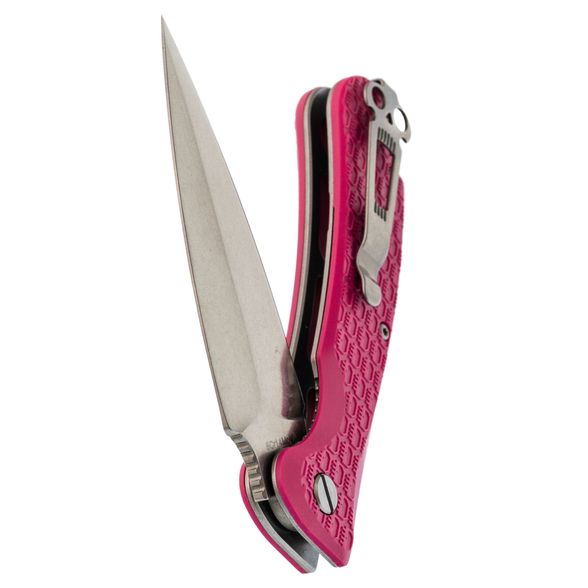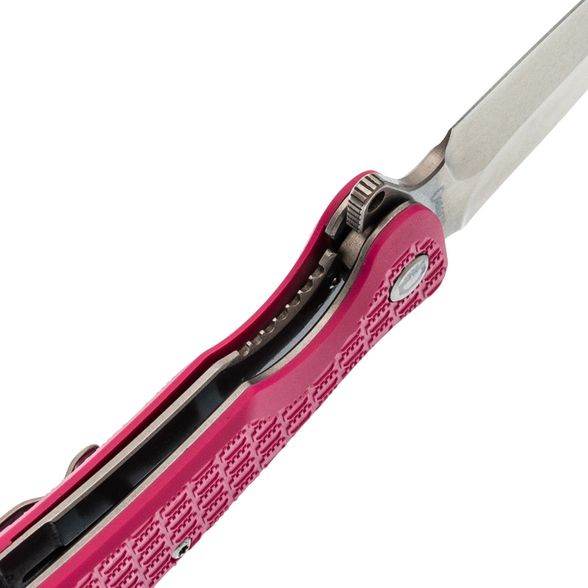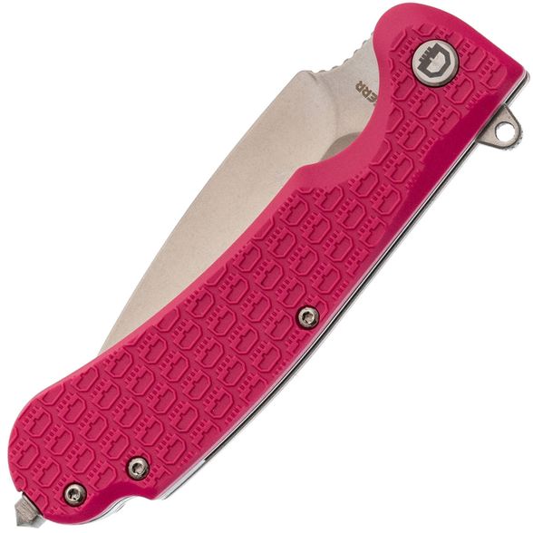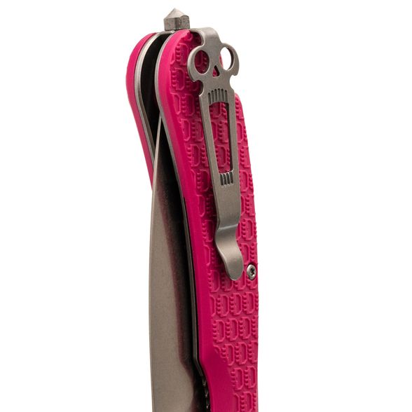 Рукоять сконструирована по классической технологии сэндвича – стальные лайнеры образуют надежную основу и замок Liner-Lock, а внешняя оболочка выполнена из прочного, легкого и неприхотливого термопластика FRN. Накладки яркого розового цвета выглядят стильно и броско, не теряясь даже на фоне изысканного интерьера. Эргономичная форма с плавным изгибом и подпальцевой выемкой гарантирует удобное сцепление, а фирменная клипса в виде кричащего черепа и темлячное отверстие добавляют практичности при ношении.
