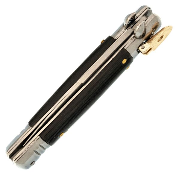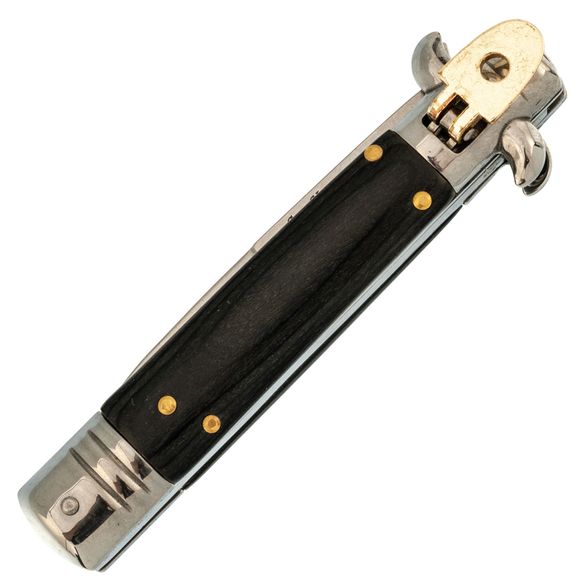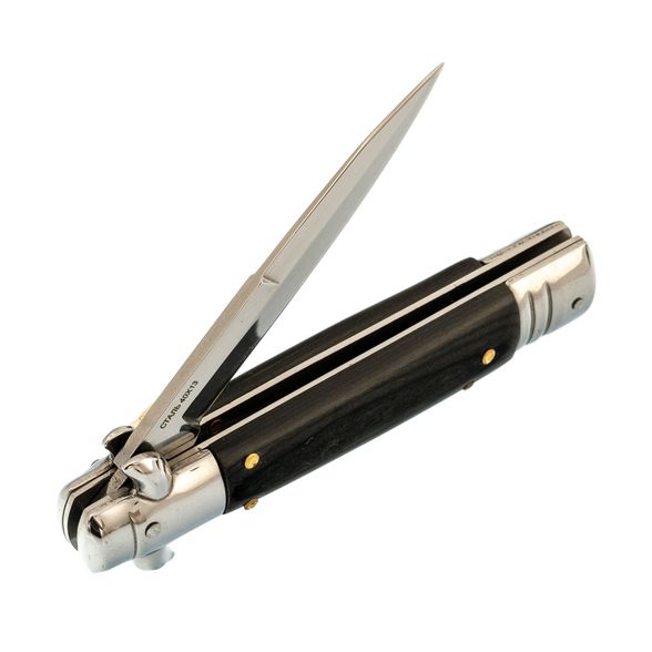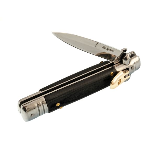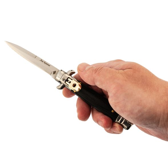 Нож оснащен механизмом автоматического выброса (auto) клинка, который выполнен из стали 40х13. Этот материал отличается неприхотливостью в обслуживании и простотой заточки, что делает нож надежным и долговечным. Клинок имеет длину 9 см и толщину 3 мм, что обеспечивает отличную резкость и прочность. Не забывайте, что рукоять имеет важное значение — в данном случае традиционный дизайн рукояти с алюминиевым больстером и навершием, а также деревянными накладками, придают ножу уникальный исторический шарм.