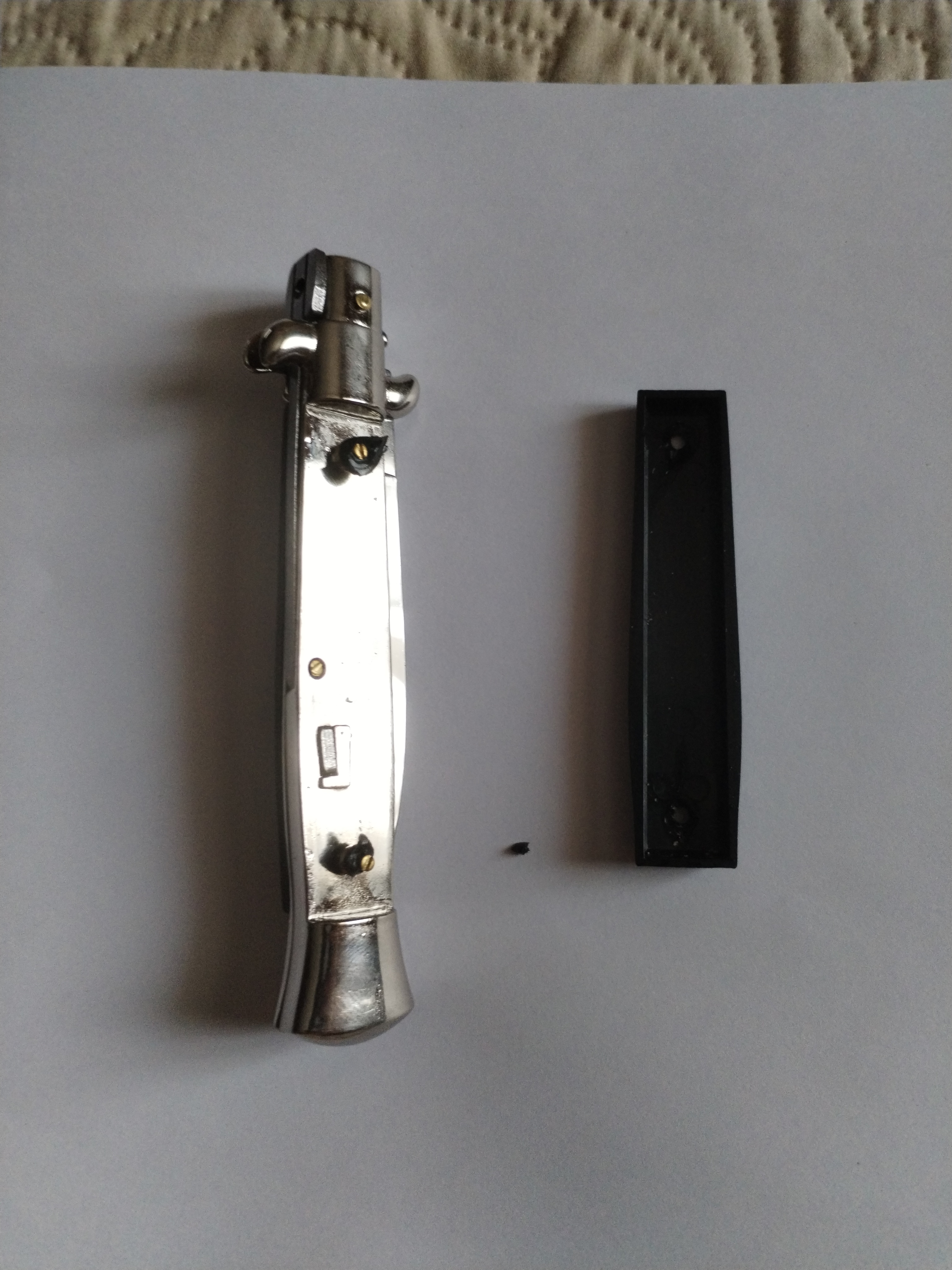 Клинок длинный и узкий, с характерной формой и спусками от обуха. За счёт такой геометрии нож уверенно режет и аккуратно входит в материал. Автоматическое открытие по кнопке работает чётко: нажал - клинок на месте, без лишних движений и суеты. Для повседневных задач это действительно удобно.