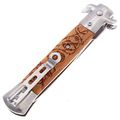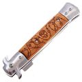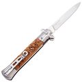 Этот нож оснащен подпружиненным открыванием, что сравнимо по скорости с автоматическим ножом. Механизм auto обеспечивает плавное и быстрое раскрытие лезвия, что делает его очень удобным в повседневной эксплуатации. Рукоять выполнена из стали с деревянными накладками в черном цвете, придающими ножу стильный и элегантный вид. Дерево дополнительно украшено выжиганием, что добавляет индивидуальности и подчеркивает мастерство производителя.