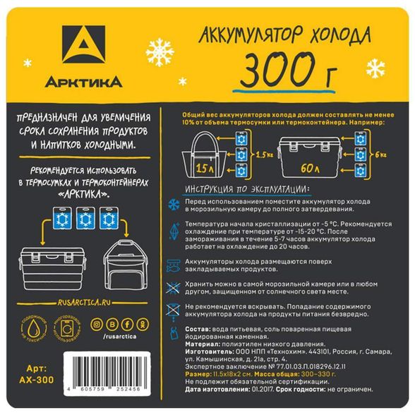 Если вы хотите увеличить время действия любой изотермической емкости, то используйте для этого аккумулятор холода Арктика АХ-300. Он будет полезен тем людям, которые собираются отправиться в поход на природу на несколько дней. Чтобы изделие начало действовать, предварительно его необходимо заморозить дома в холодильнике. Время затвердевания жидкости внутри изделия может варьироваться от 5 до 10 ч. Аккумулятор нужно располагать поверх продуктов в холодильнике.