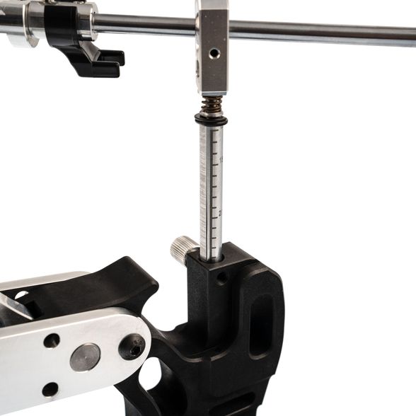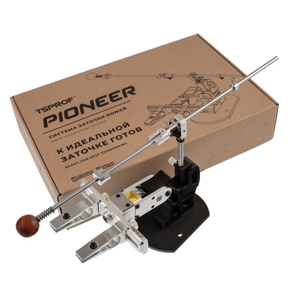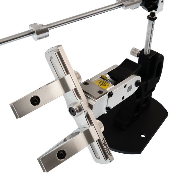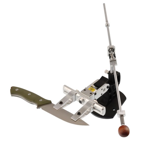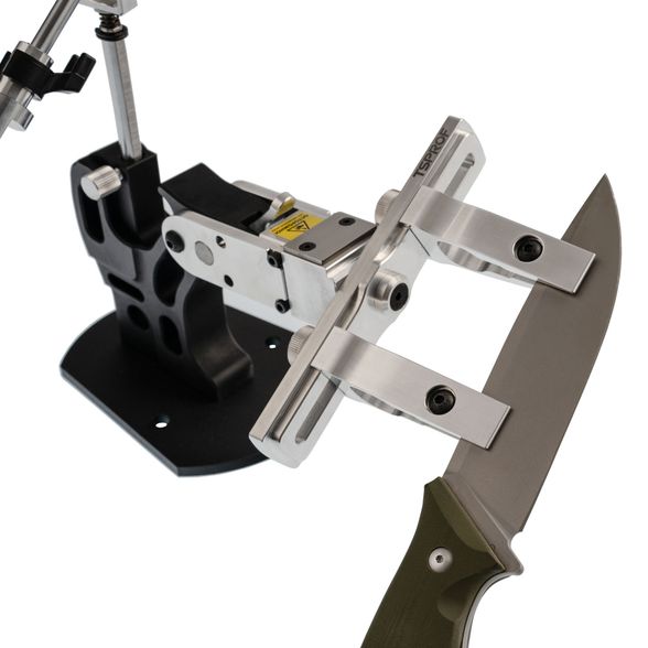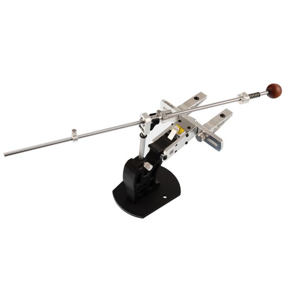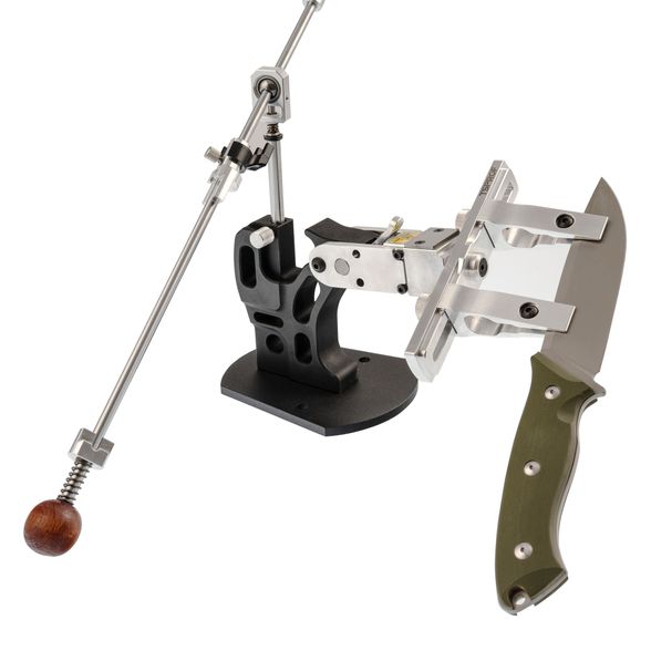 Штифта с креплением для камня, бруска или другого абразивного инструмента. В устройстве предусмотрены регулировочные винты, которыми выставляется нужная высота, соответственно, угол заточки режущей кромки. Благодаря такому устройству можно выполнять доводку ножей с любым профилем за исключением вогнутого.